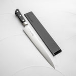 The Sujihiki knife, a traditional Japanese slicer, is designed for carving and fileting. With its long, narrow blade, typically ranging from 240mm to 330mm, it excels in creating clean, smooth cuts through meat and fish. Its length ensures long, uninterrupted strokes, making it perfect for precise slicing tasks.