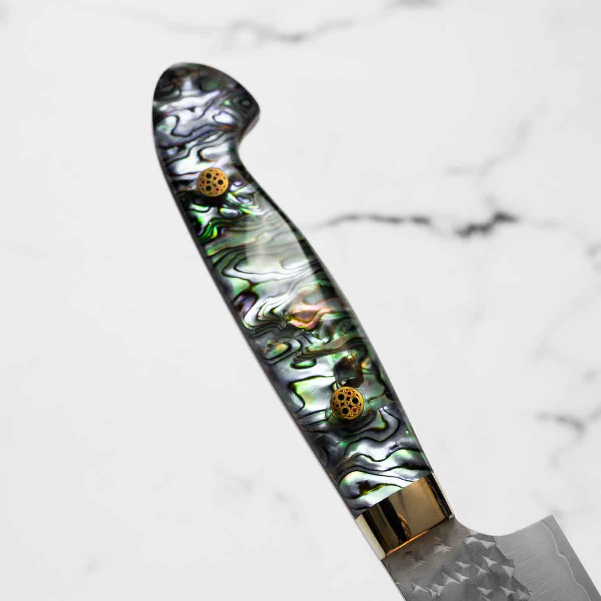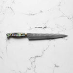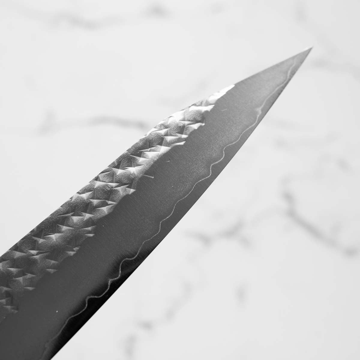 His knives are instantly recognizable for their striking Tsuchime and Suminagashi finishes, thin grinds, and use of high-performance steels such as SG2, HAP40, and stainless-clad Blue Super. Kurosaki’s Fujin series, with its dramatic wind-patterned hammer finish, helped cement his reputation as a blacksmith who blends artistry and technical brilliance in equal measure.