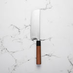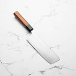 The Nakiri knife, revered in Japanese culinary traditions, is engineered for exceptional vegetable cutting. Featuring a distinct, straight-edged, and rectangular blade, it excels in creating uniform, precise cuts and aesthetic presentation. Its technical design ensures efficiency and precision, making it a valuable tool for both professional chefs and home cooks.