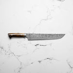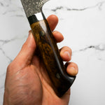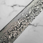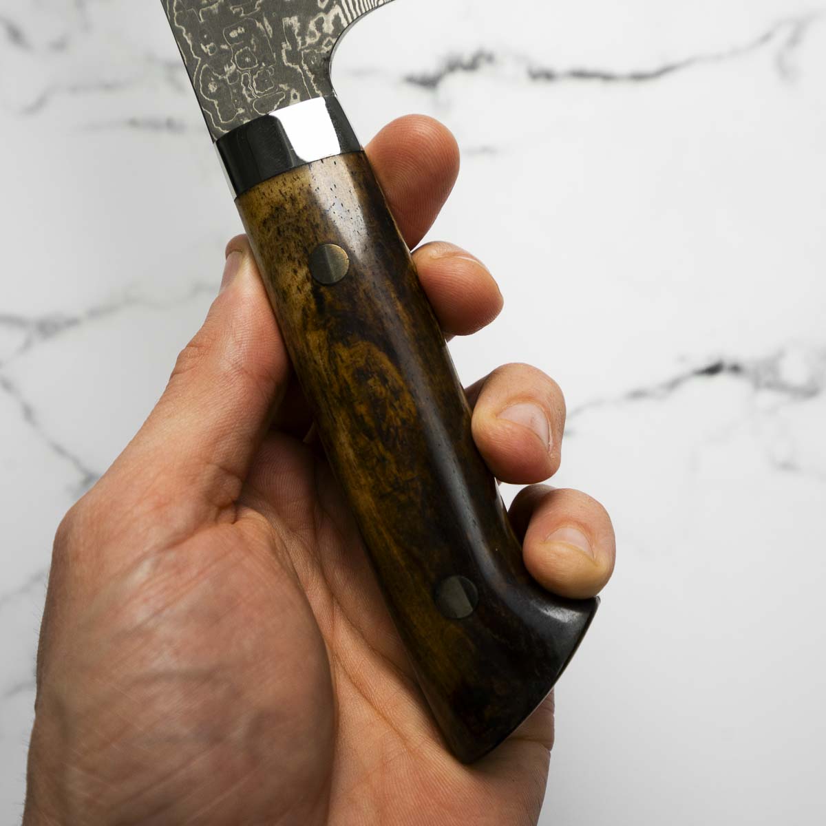 He works across a wide spectrum of steels, from classic Japanese carbon steels to advanced stainless alloys like R2 and VG10. His signature Damascus finishes — including Rainbow, Diamond, and Black Nickel — are unmistakable, and are often paired with an eclectic range of handle styles that reflect both innovation and deep respect for materials.