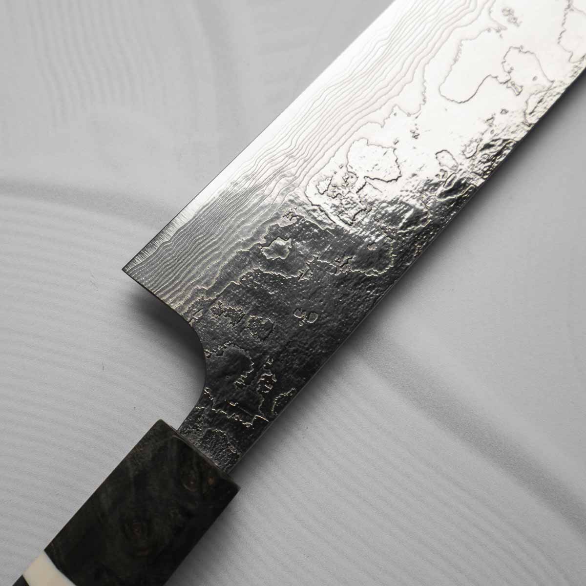 He works across a wide spectrum of steels, from classic Japanese carbon steels to advanced stainless alloys like R2 and VG10. His signature Damascus finishes — including Rainbow, Diamond, and Black Nickel — are unmistakable, and are often paired with an eclectic range of handle styles that reflect both innovation and deep respect for materials.