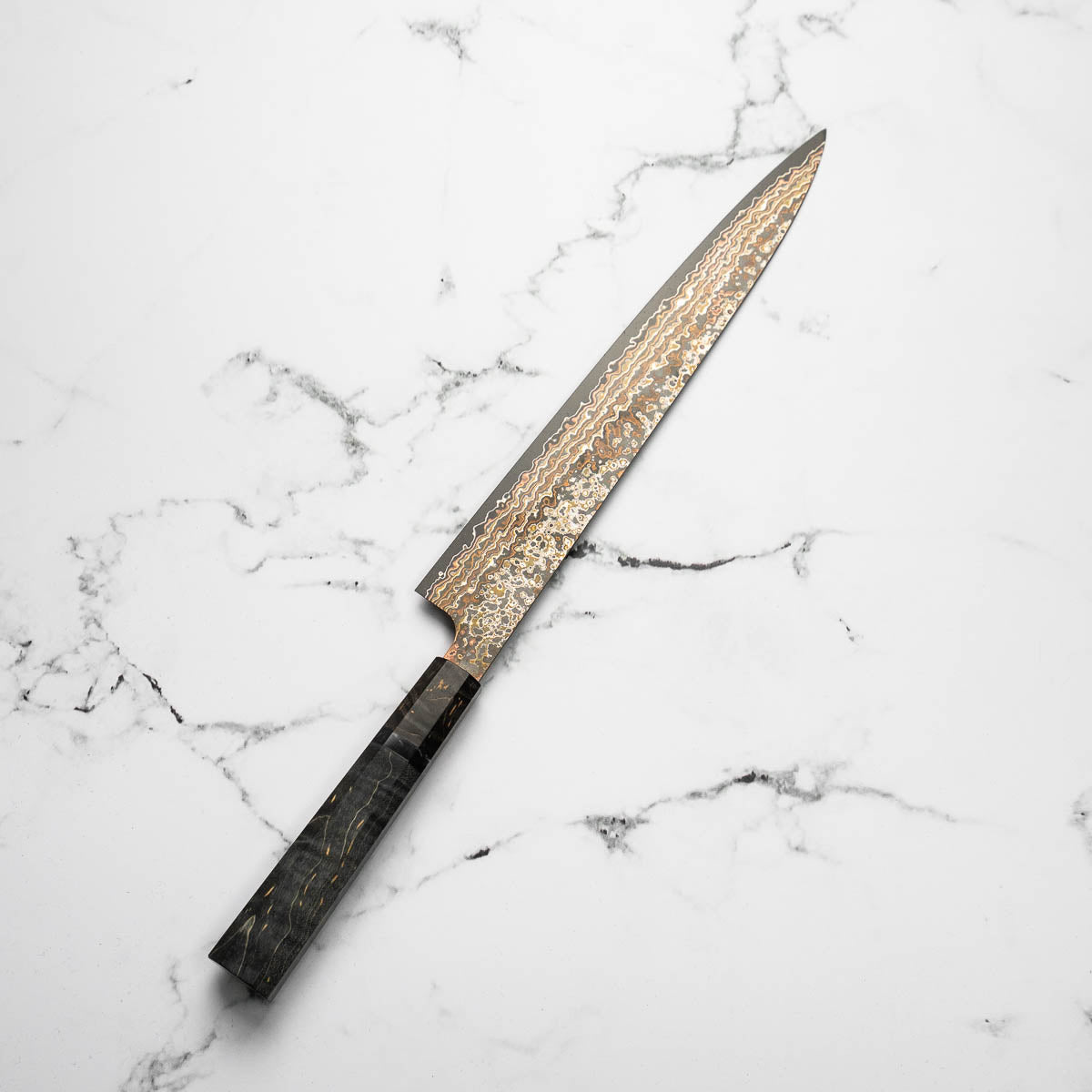 Takeshi Saji VG10-W Nashiji Rainbow Damascus Sujihiki 270mm - Dark Maple