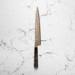 The Sujihiki knife, a traditional Japanese slicer, is designed for carving and fileting. With its long, narrow blade, typically ranging from 240mm to 330mm, it excels in creating clean, smooth cuts through meat and fish. Its length ensures long, uninterrupted strokes, making it perfect for precise slicing tasks.
