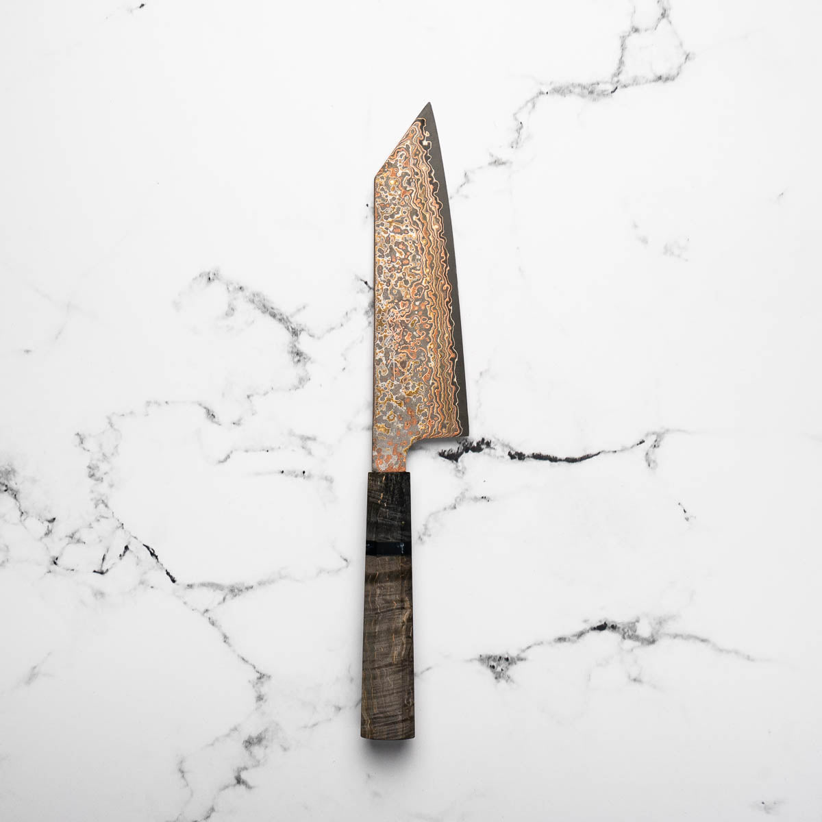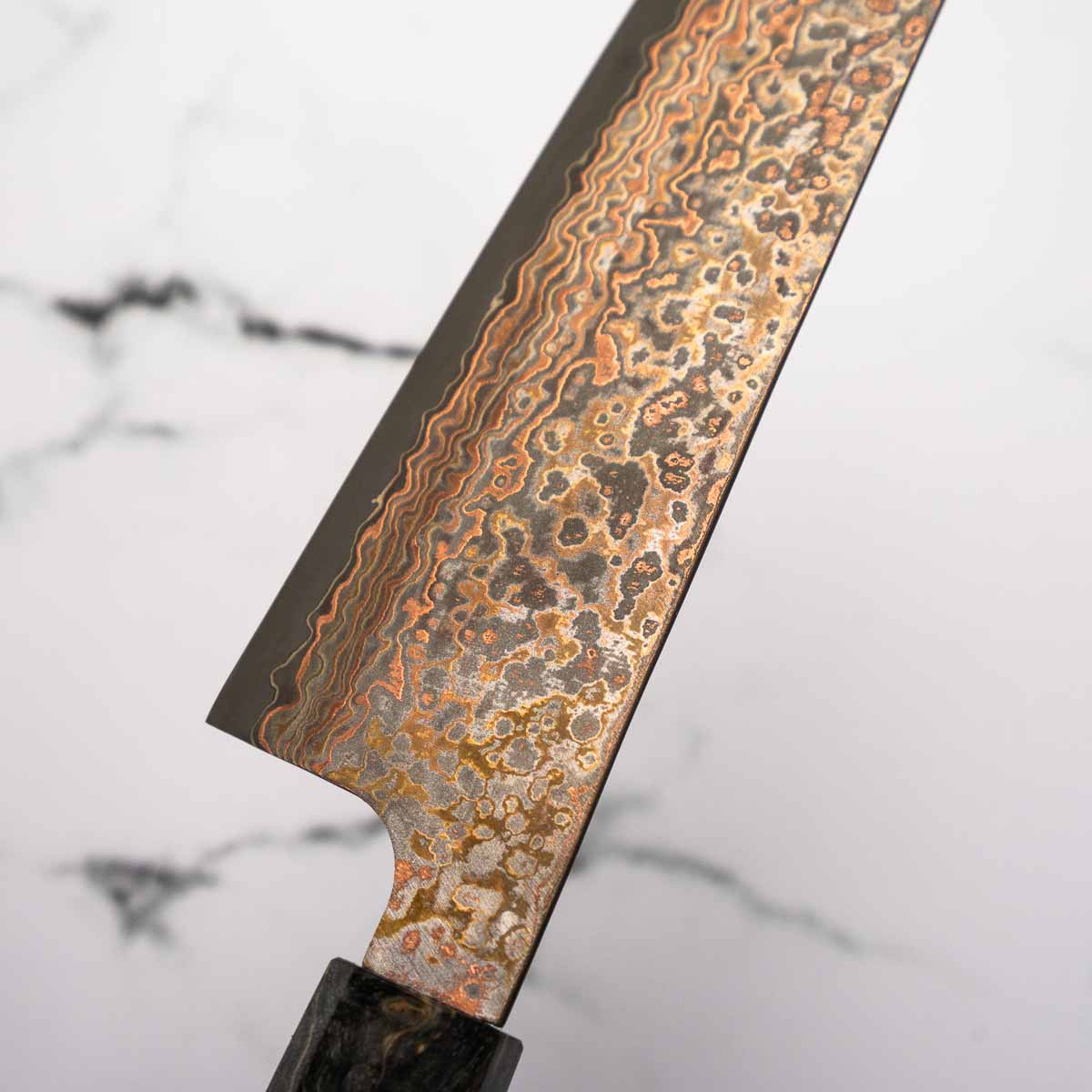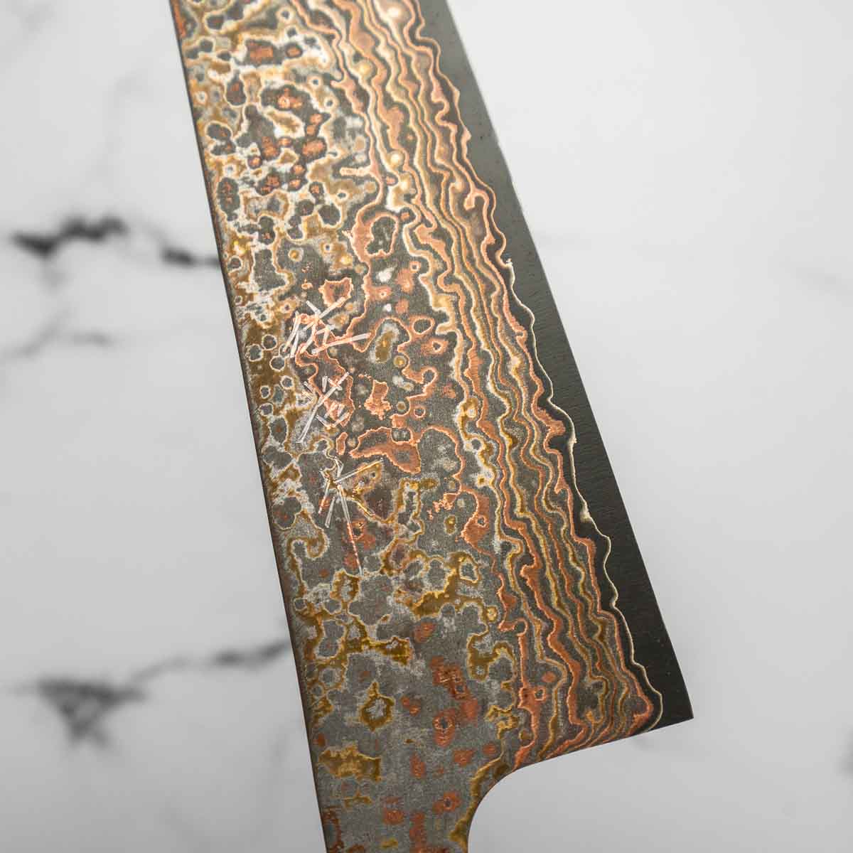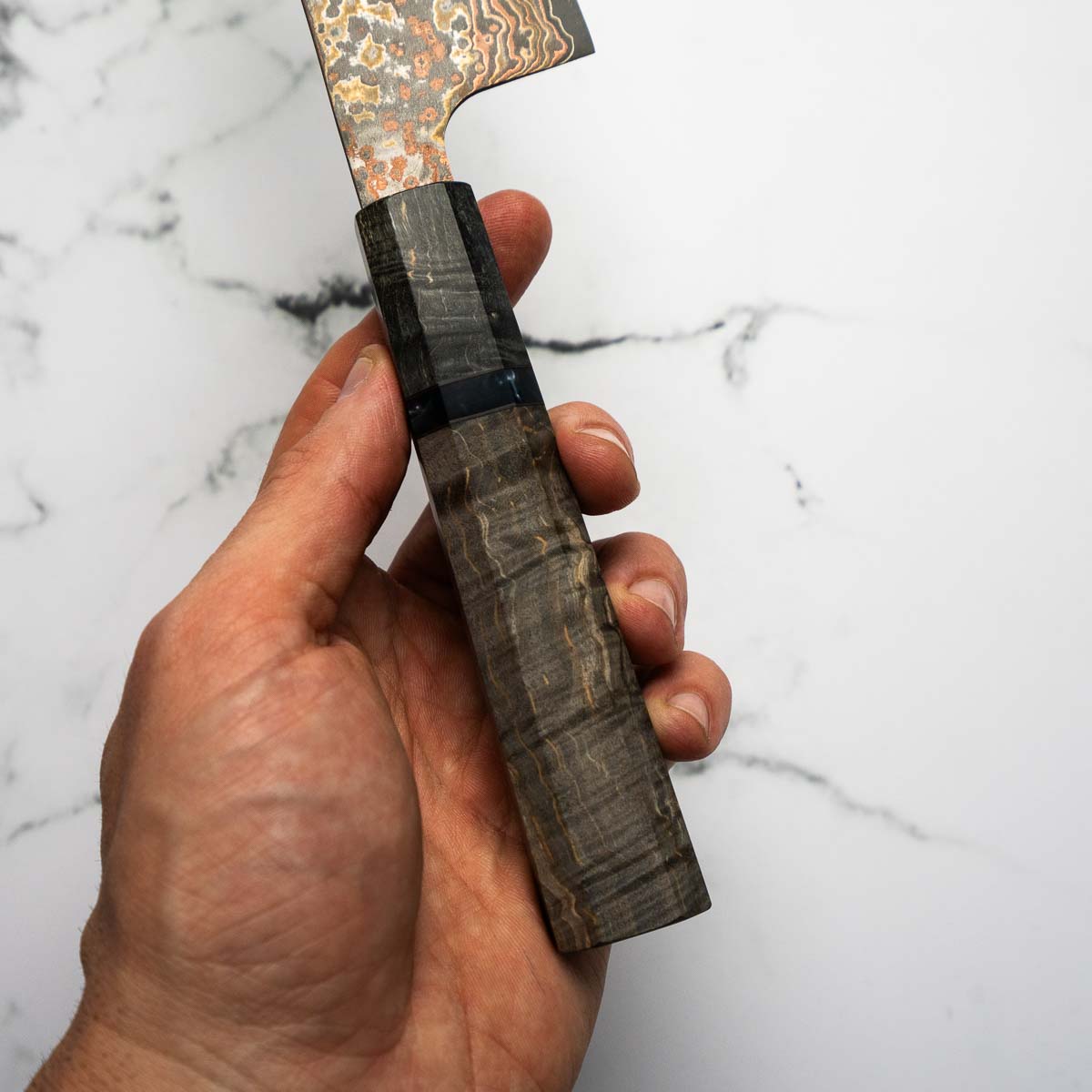 He works across a wide spectrum of steels, from classic Japanese carbon steels to advanced stainless alloys like R2 and VG10. His signature Damascus finishes — including Rainbow, Diamond, and Black Nickel — are unmistakable, and are often paired with an eclectic range of handle styles that reflect both innovation and deep respect for materials.
