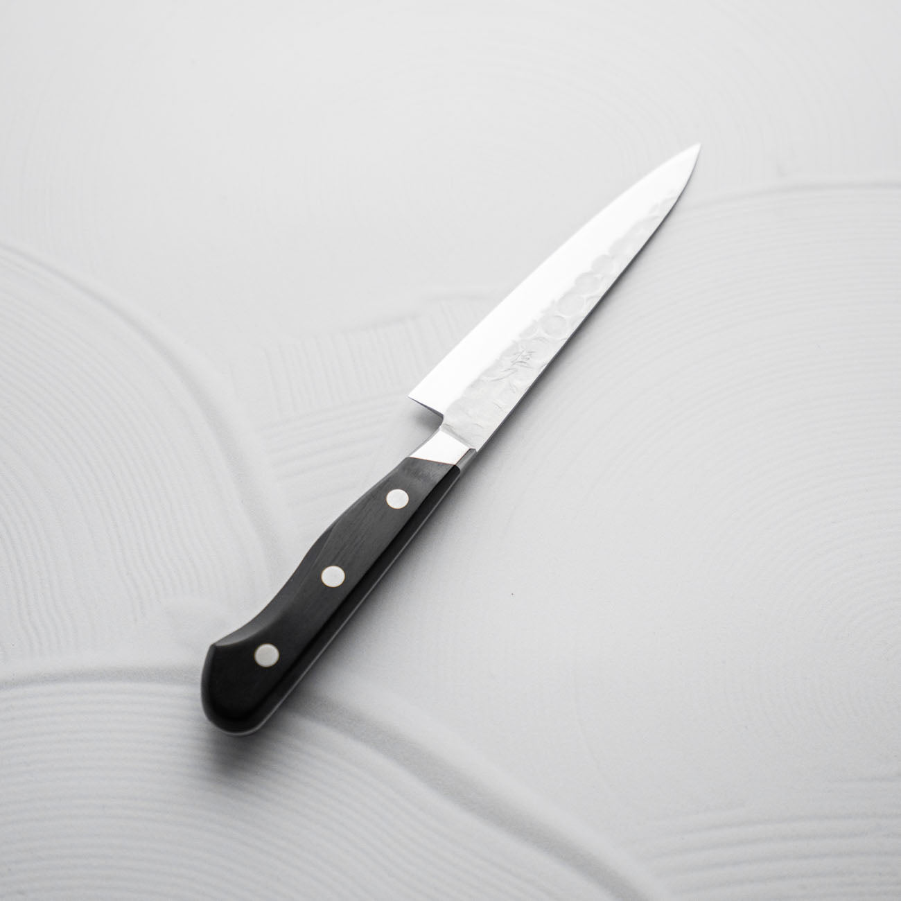 The Petty knife, a quintessential tool in Japanese cuisine, is a smaller utility knife used for precise, delicate tasks. Often considered a smaller sibling to the chef's knife, it excels in hand-held tasks like peeling, trimming, and intricate cutting. Its versatility makes it an essential for detailed culinary work.