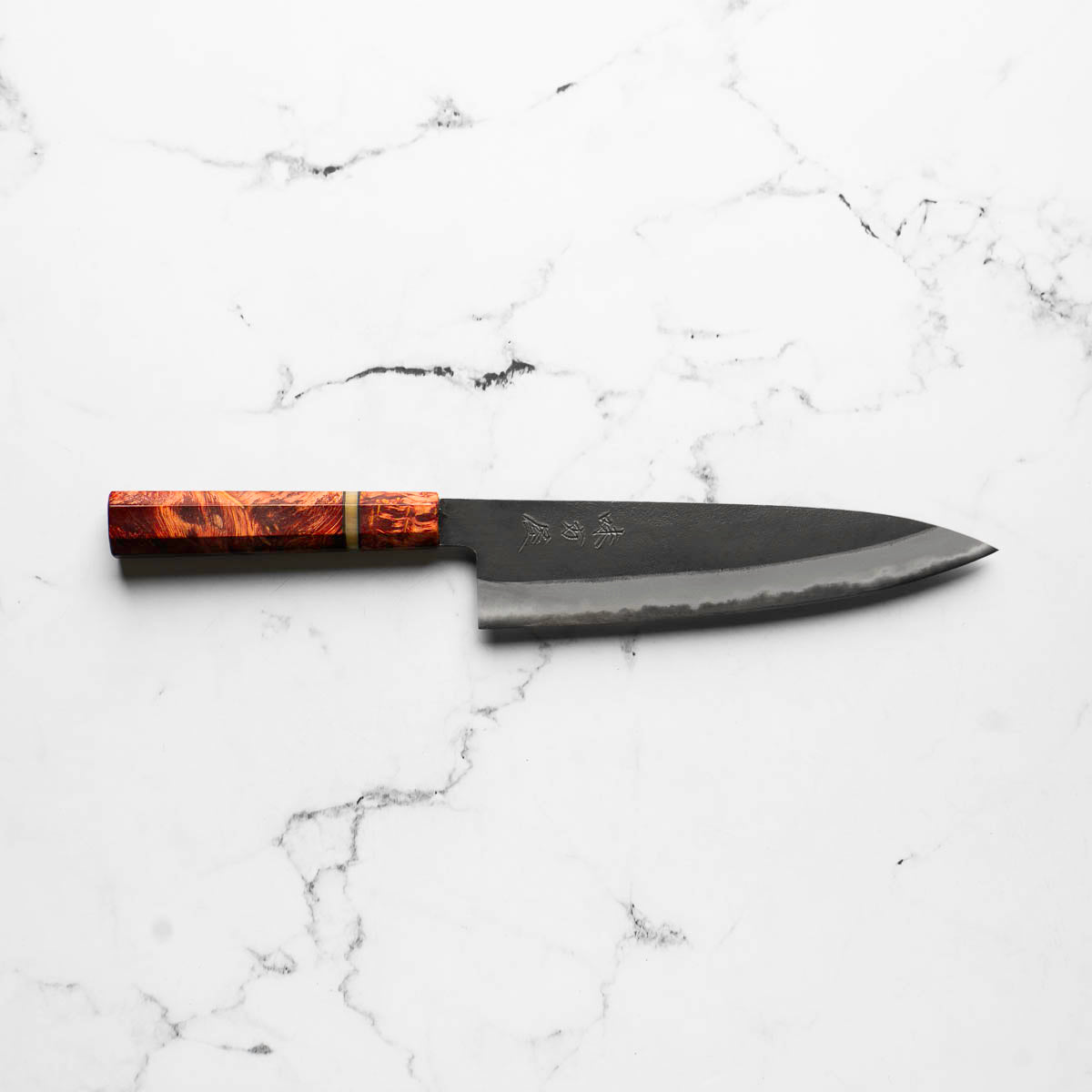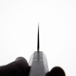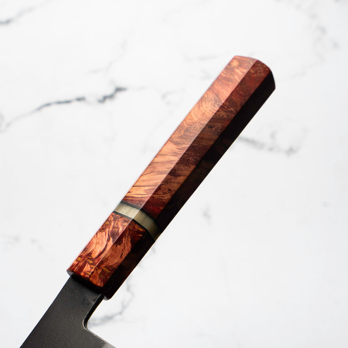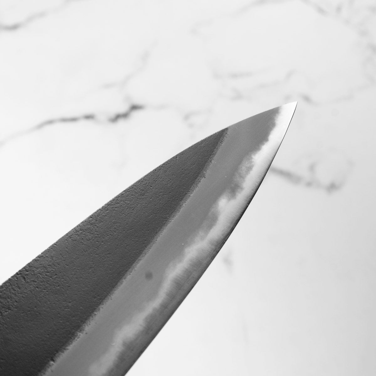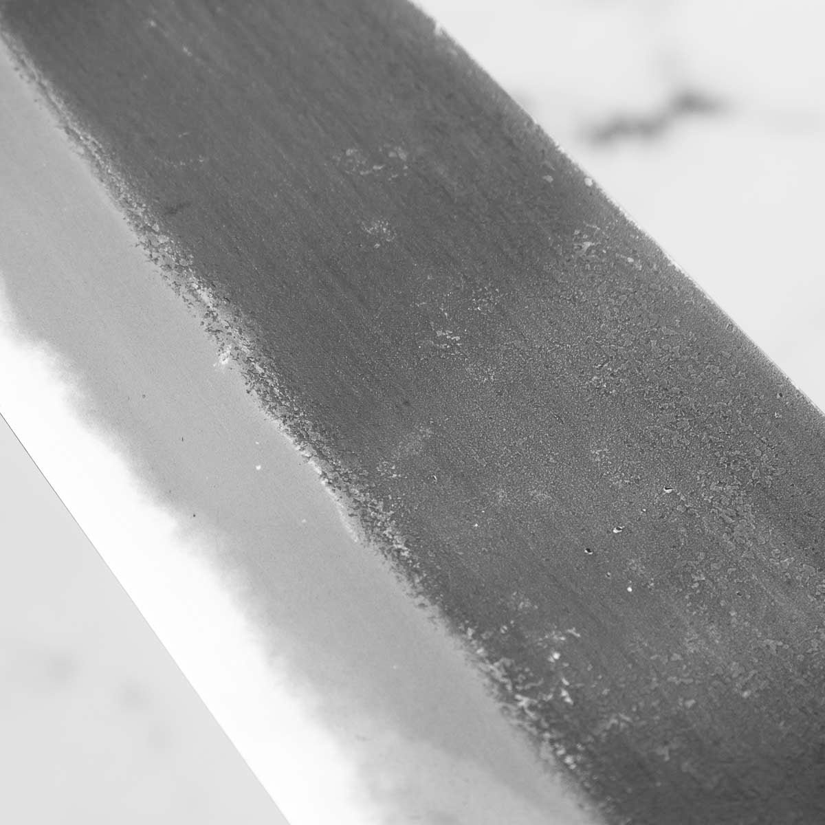 Japanese White Steel #2, a traditional high-carbon steel, is cherished for its purity and fine grain structure, enabling razor-sharp edges, at the cost of being reactive. It is one of the easiest steels to sharpen, but cannot be left wet for even short periods otherwise rust spots can occur. If you’re fastidious in your knife maintenance, this knife steel can be extremely rewarding to use.