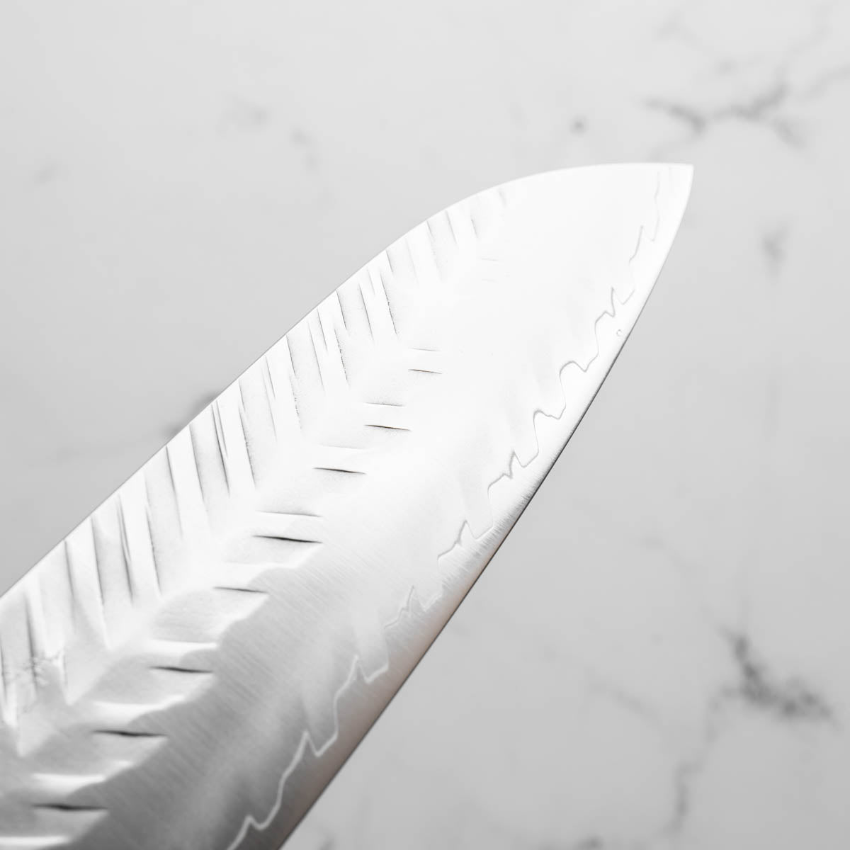 The Santoku knife, a classic in Japanese kitchens, translates to "three virtues," symbolizing its proficiency in slicing, dicing, and mincing. With a shorter, versatile blade and a balanced design, it's ideal for a range of tasks, from cutting meat to chopping vegetables, making it a beloved all-purpose tool.
