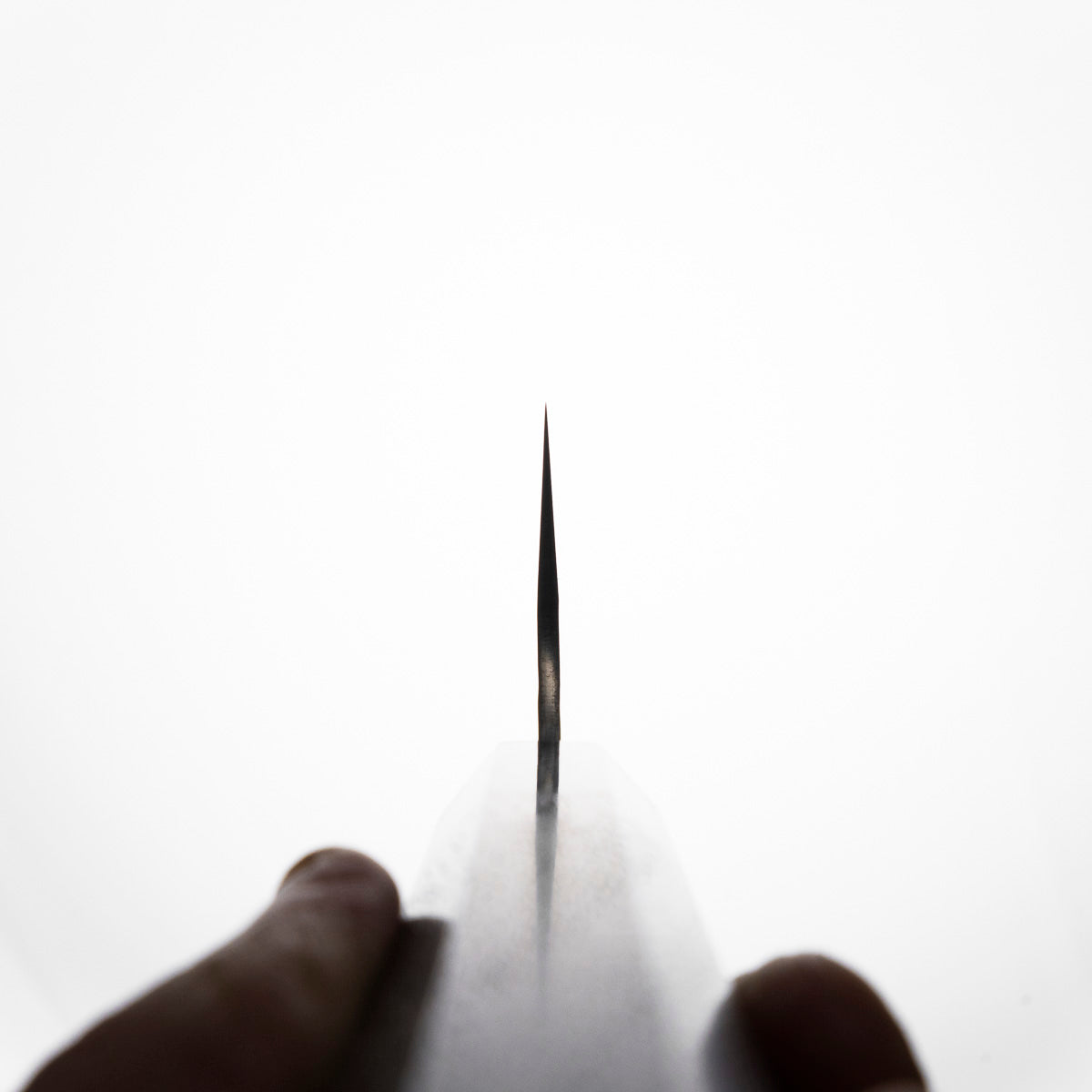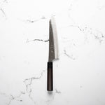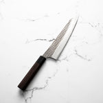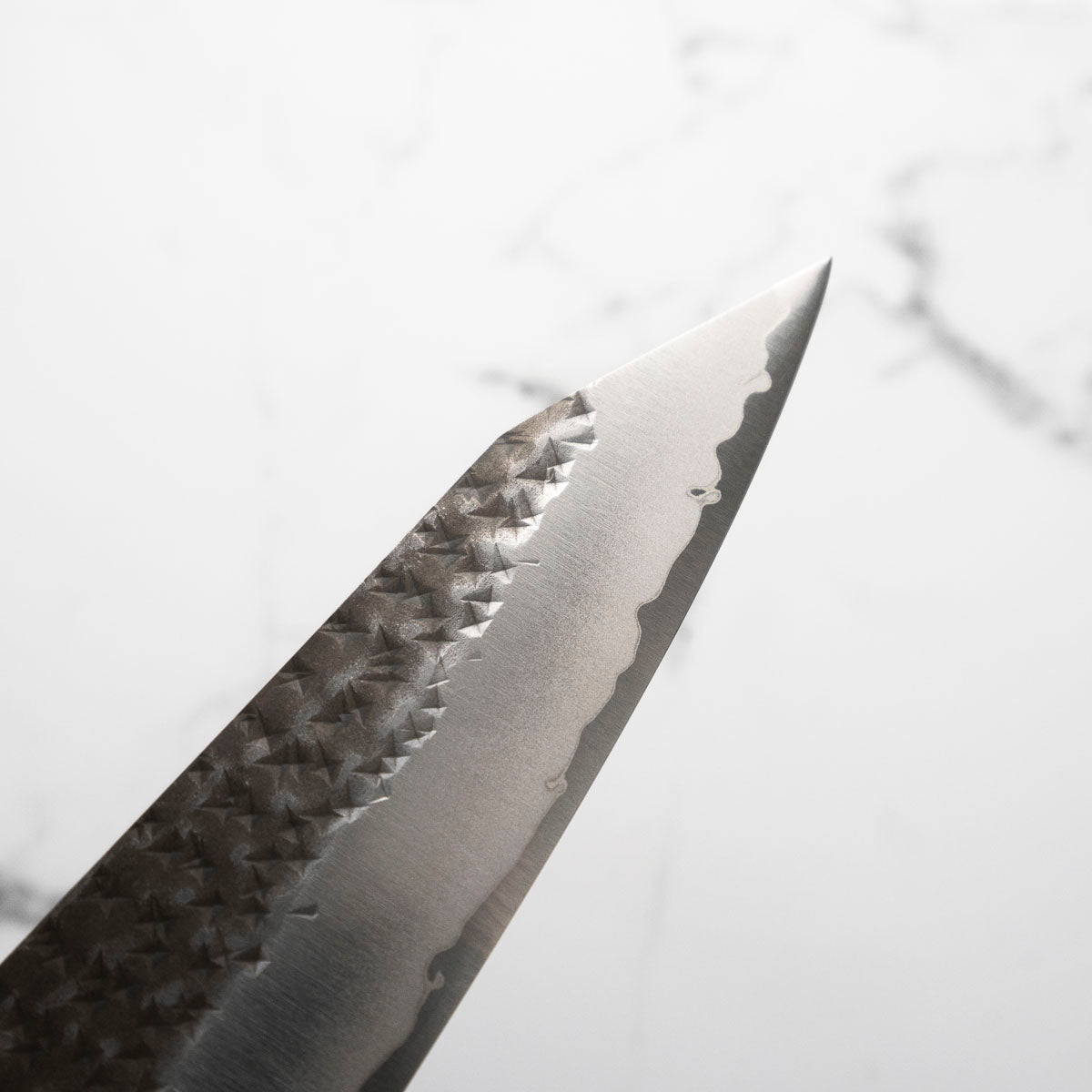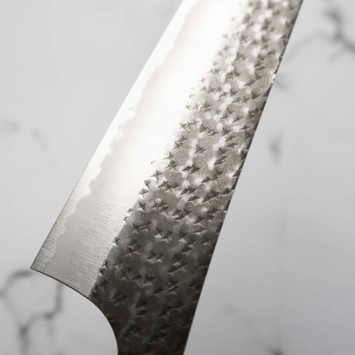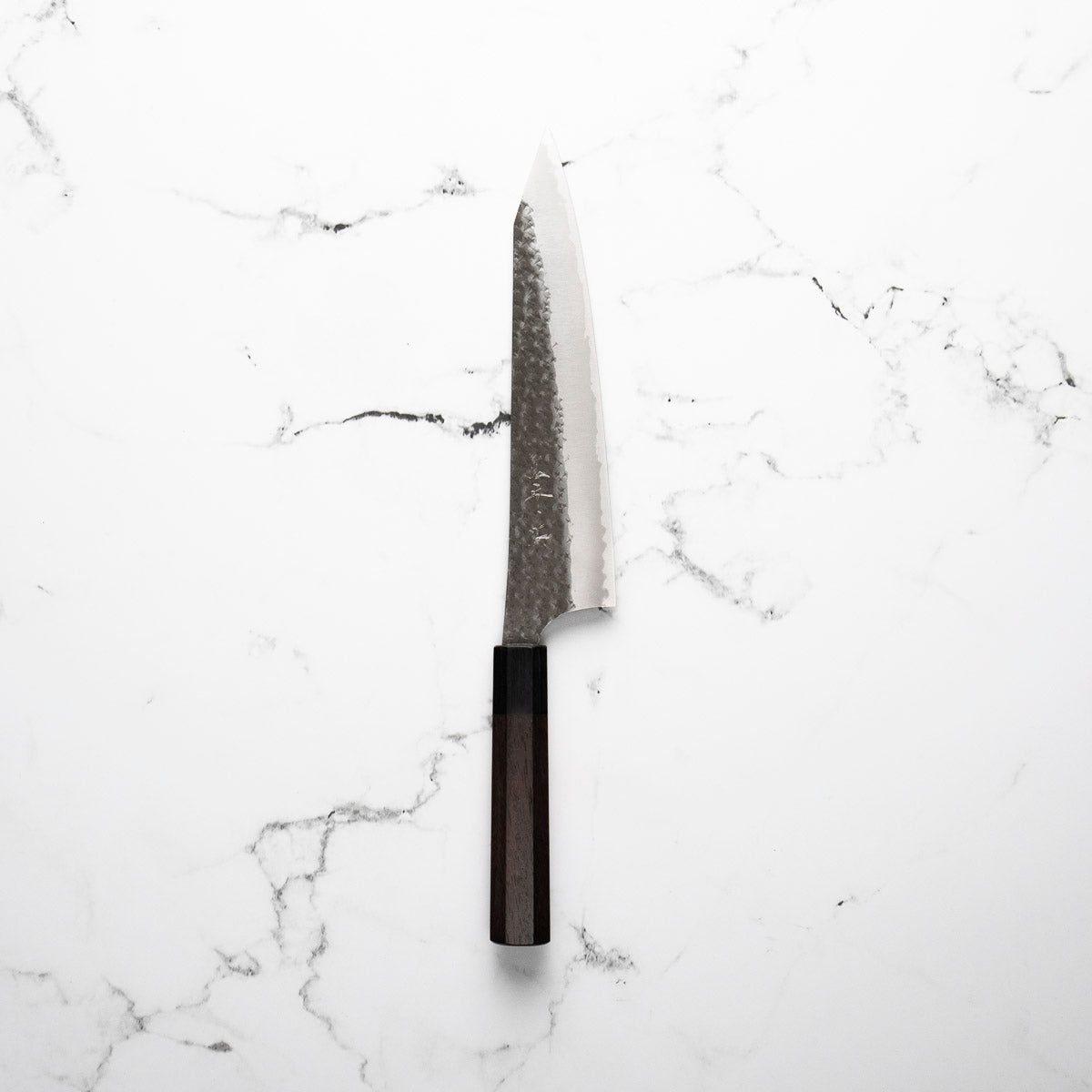 His knives are instantly recognizable for their striking Tsuchime and Suminagashi finishes, thin grinds, and use of high-performance steels such as SG2, HAP40, and stainless-clad Blue Super. Kurosaki’s Fujin series, with its dramatic wind-patterned hammer finish, helped cement his reputation as a blacksmith who blends artistry and technical brilliance in equal measure.