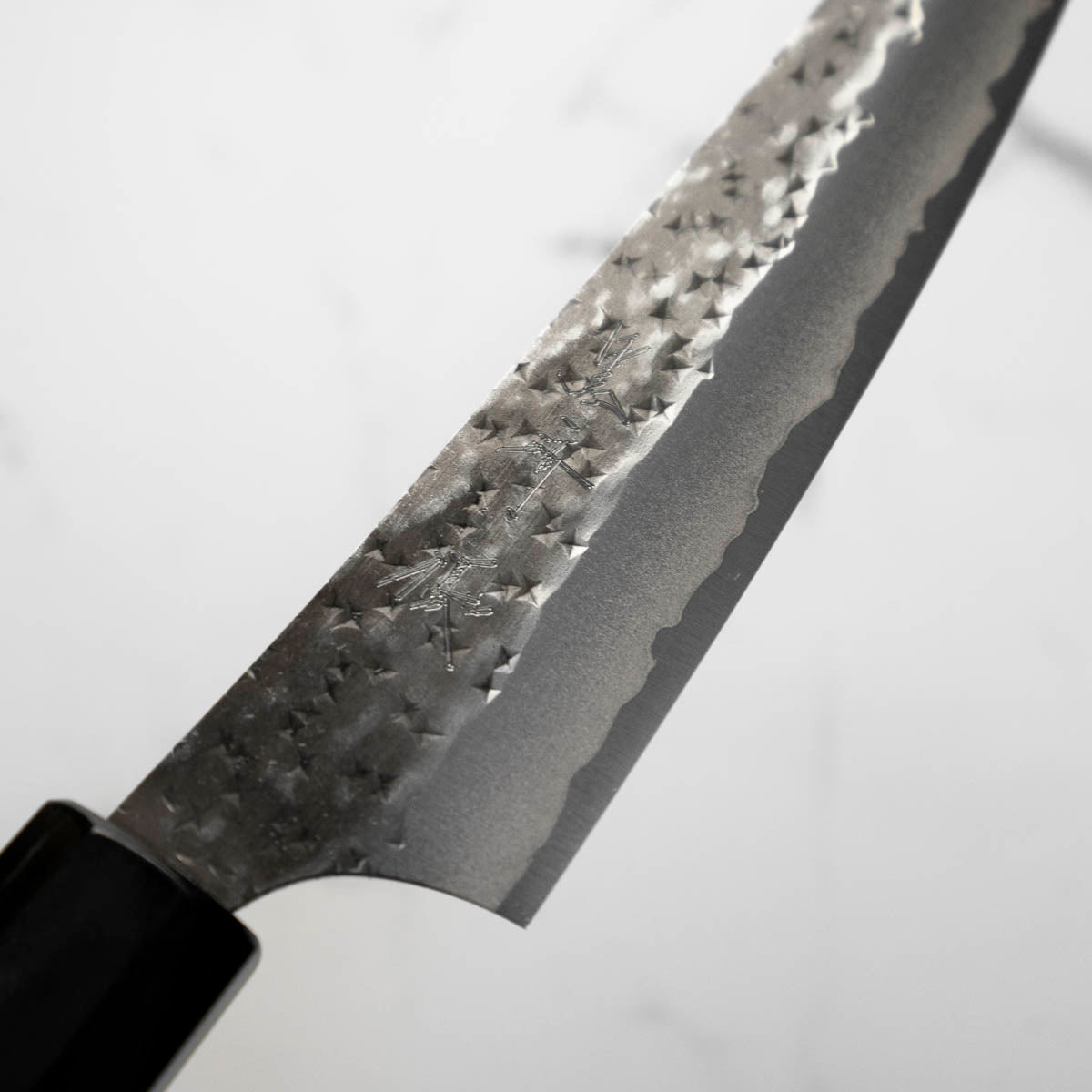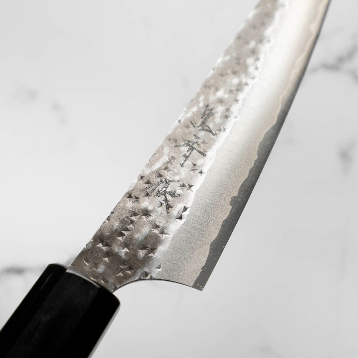 His knives are instantly recognizable for their striking Tsuchime and Suminagashi finishes, thin grinds, and use of high-performance steels such as SG2, HAP40, and stainless-clad Blue Super. Kurosaki’s Fujin series, with its dramatic wind-patterned hammer finish, helped cement his reputation as a blacksmith who blends artistry and technical brilliance in equal measure.