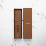 We ditched the bland and clinical look of tongs, and replaced it with a soft streamlined shape. The namesake feature, a curved stand in the middle of the tool provides a wide surface area for finger placement and grip. The stand also keeps the tips elevated off the ground while not in use. Each piece is stamped, etched, and finished by hand at Mr. Ando’s workshop.