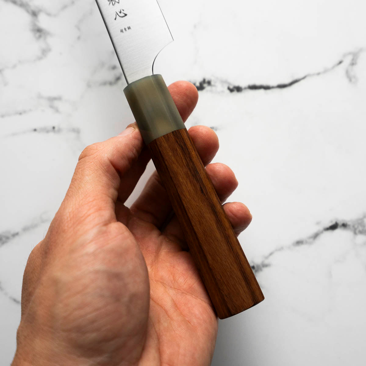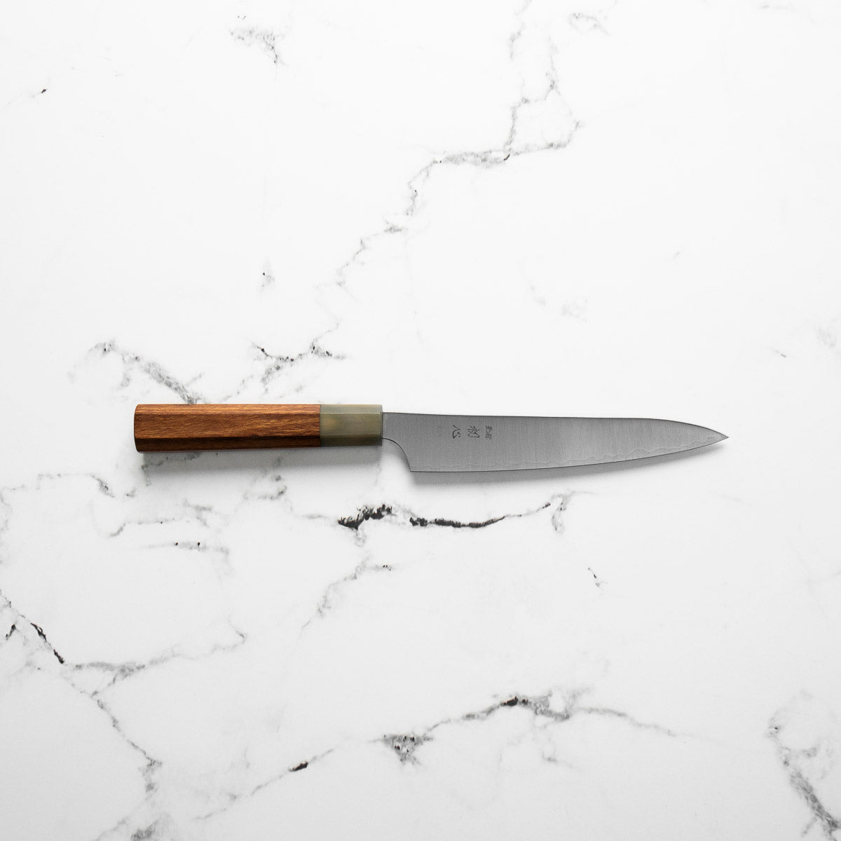 The Petty knife, a quintessential tool in Japanese cuisine, is a smaller utility knife used for precise, delicate tasks. Often considered a smaller sibling to the chef's knife, it excels in hand-held tasks like peeling, trimming, and intricate cutting. Its versatility makes it an essential for detailed culinary work.