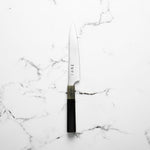 The Petty knife, a quintessential tool in Japanese cuisine, is a smaller utility knife used for precise, delicate tasks. Often considered a smaller sibling to the chef's knife, it excels in hand-held tasks like peeling, trimming, and intricate cutting. Its versatility makes it an essential for detailed culinary work.