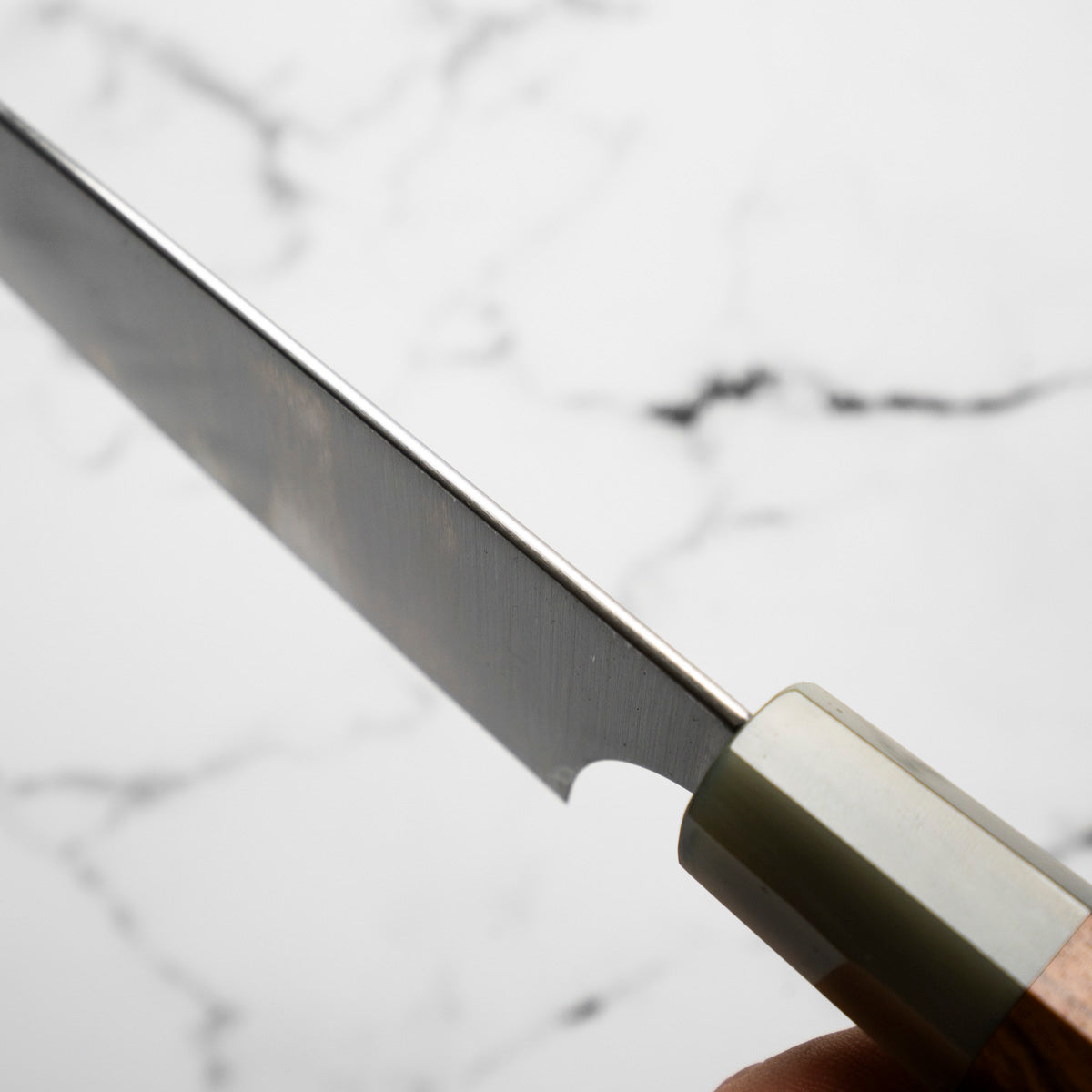 This knife is made from a high-carbon steel and as such, will require a little more care than a regular off-the-shelf knife. It must be dried shortly after use, as prolonged exposure to moisture can cause rust spots to appear. A very light coat of oil during storage also helps to prevent rust spots. A patina (coloration and seasoning of the steel) will occur with use.