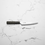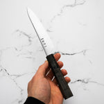 The Petty knife, a quintessential tool in Japanese cuisine, is a smaller utility knife used for precise, delicate tasks. Often considered a smaller sibling to the chef's knife, it excels in hand-held tasks like peeling, trimming, and intricate cutting. Its versatility makes it an essential for detailed culinary work.