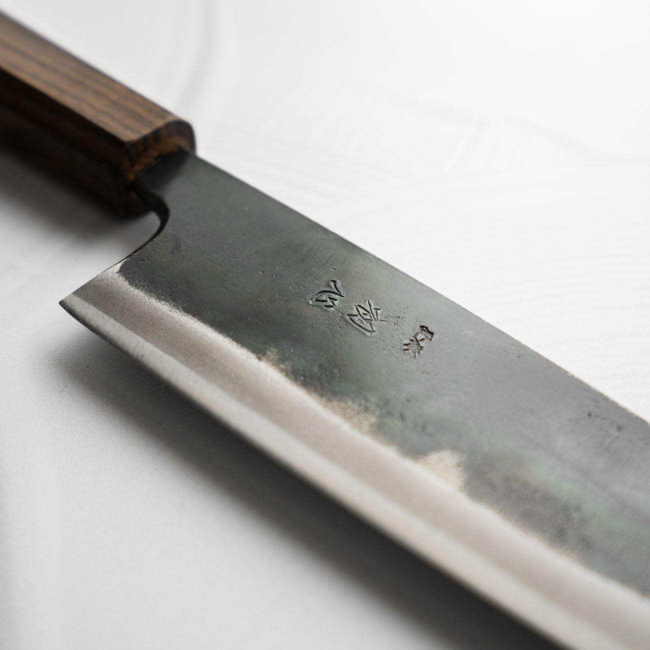 This knife is made from a high-carbon steel and as such, will require a little more care than a regular off-the-shelf knife. It must be dried shortly after use, as prolonged exposure to moisture can cause rust spots to appear. A very light coat of oil during storage also helps to prevent rust spots. A patina (colouration and seasoning of the steel) will occur with use.