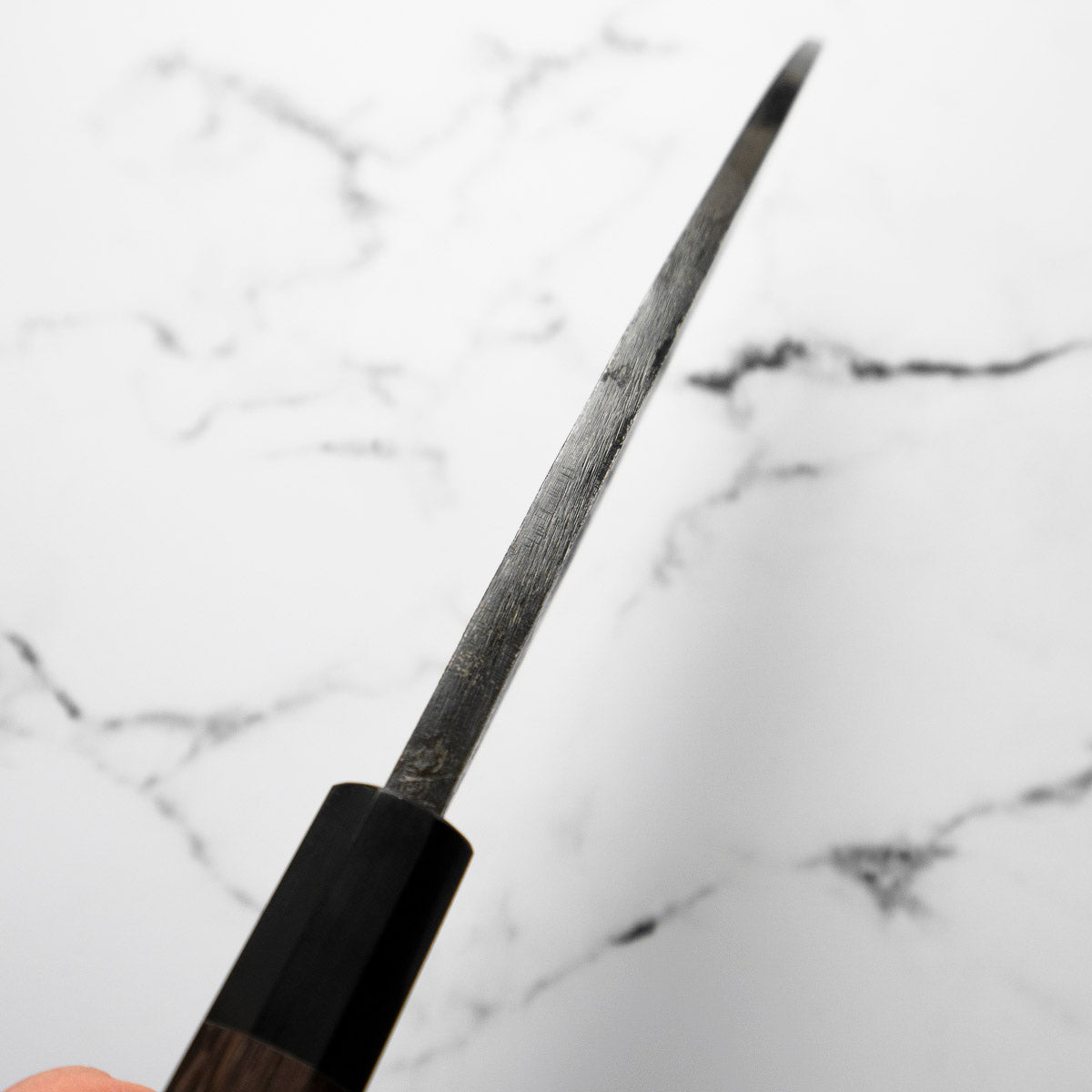 This knife is made from a high-carbon steel and as such, will require a little more care than a regular off-the-shelf knife. It must be dried shortly after use, as prolonged exposure to moisture can cause rust spots to appear. A very light coat of oil during storage also helps to prevent rust spots. A patina (colouration and seasoning of the steel) will occur with use.
