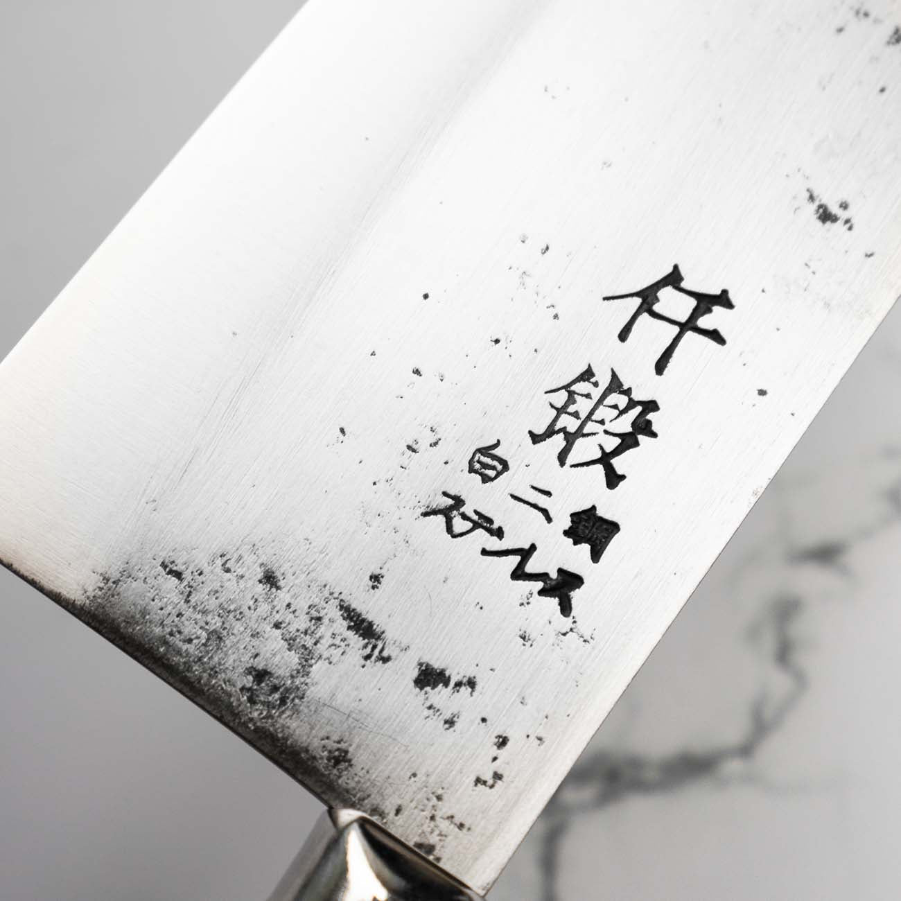 Japanese White Steel #2, a traditional high-carbon steel, is cherished for its purity and fine grain structure, enabling razor-sharp edges, at the cost of being reactive. It is one of the easiest steels to sharpen, but cannot be left wet for even short periods otherwise rust spots can occur. If you’re fastidious in your knife maintenance, this knife steel can be extremely rewarding to use.