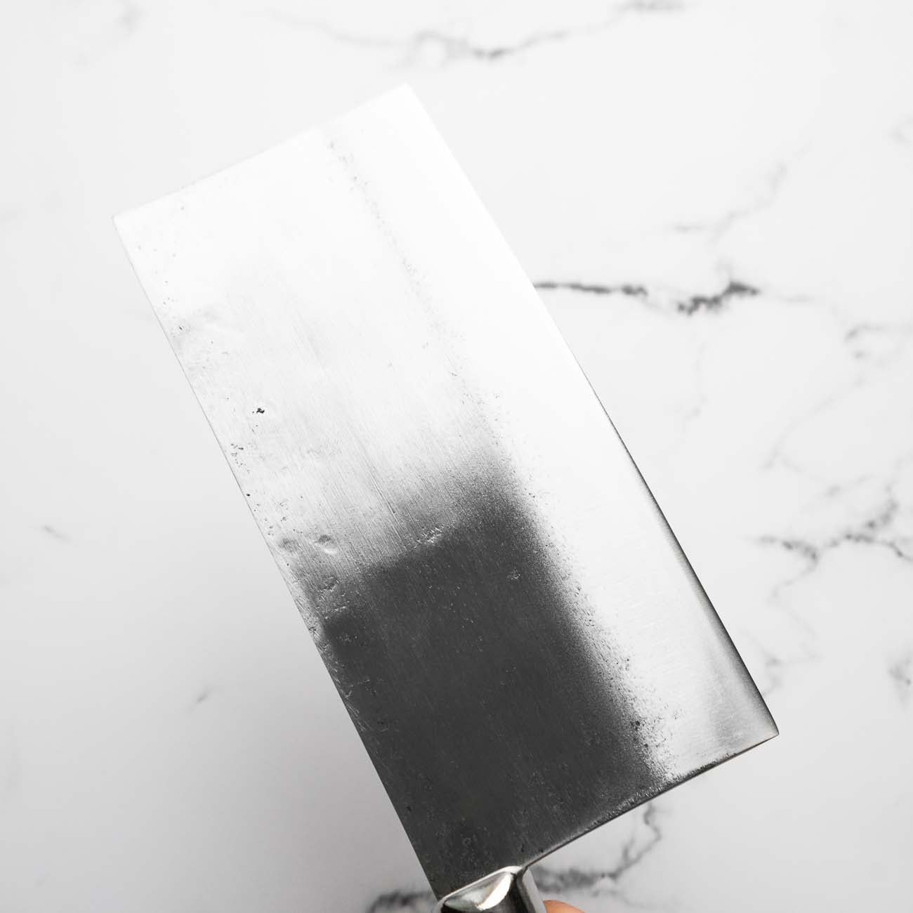 This knife is made from a high-carbon steel and as such, will require a little more care than a regular off-the-shelf knife. It must be dried shortly after use, as prolonged exposure to moisture can cause rust spots to appear. A very light coat of oil during storage also helps to prevent rust spots. A patina (colouration and seasoning of the steel) will occur with use.