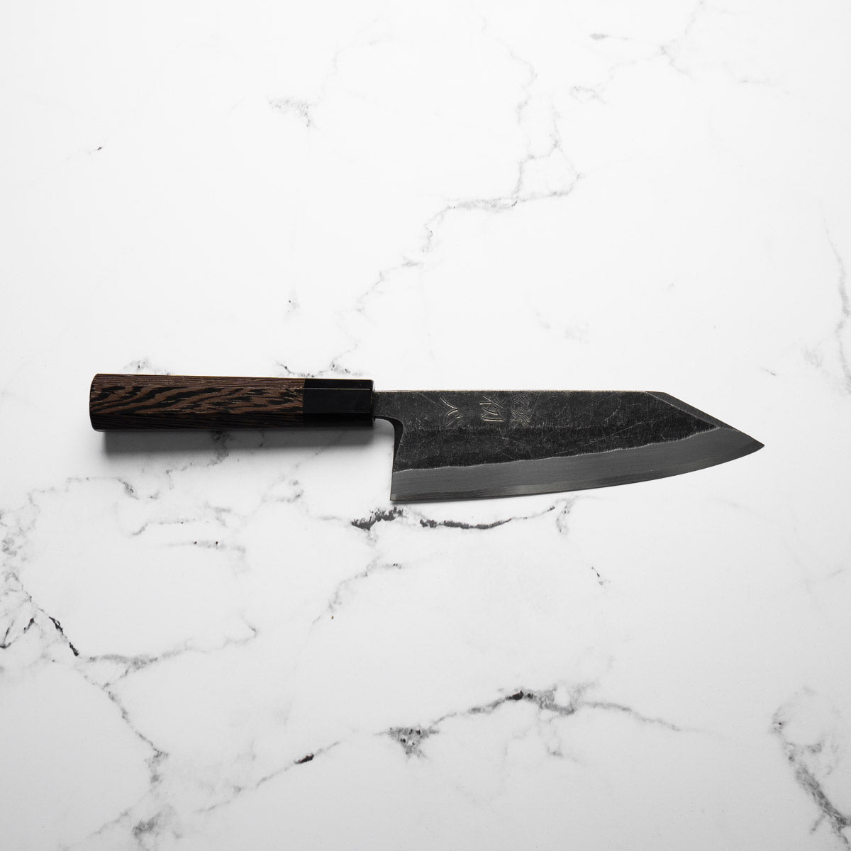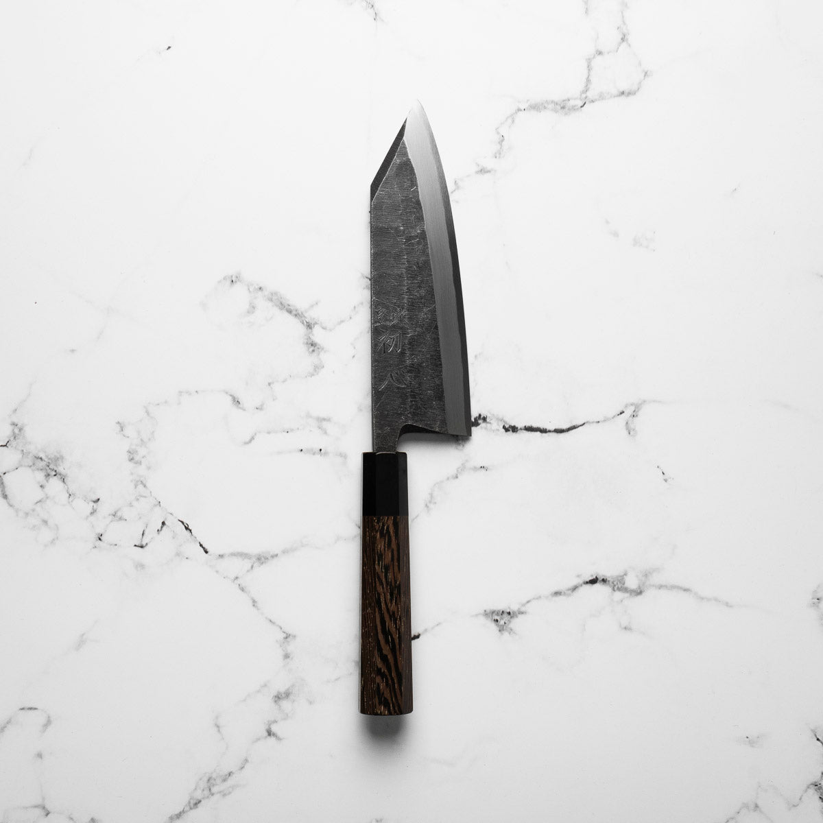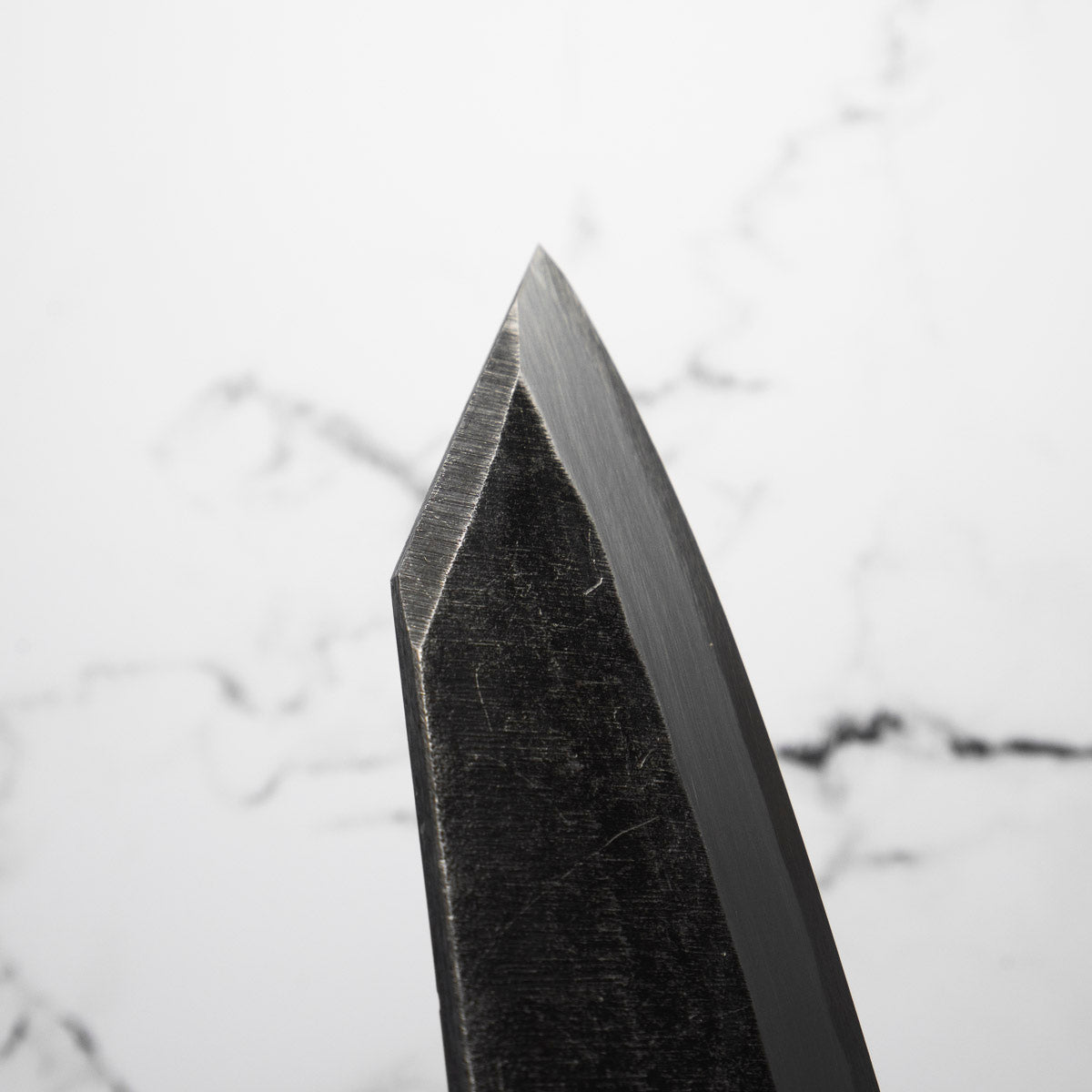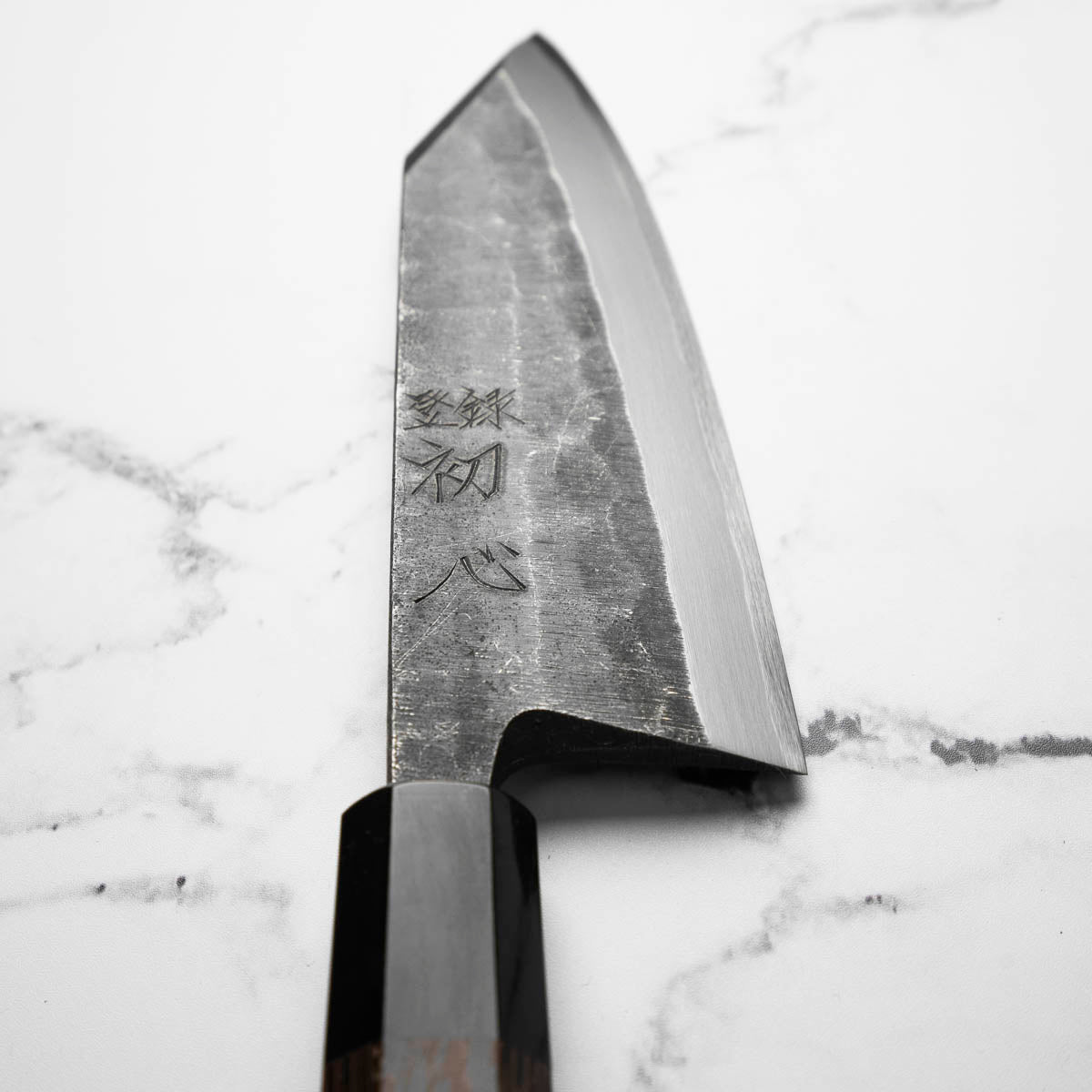 Japanese White Steel #2, a traditional high-carbon steel, is cherished for its purity and fine grain structure, enabling razor-sharp edges, at the cost of being reactive. It is one of the easiest steels to sharpen, but cannot be left wet for even short periods otherwise rust spots can occur. If you’re fastidious in your knife maintenance, this knife can steel can be extremely rewarding to use.