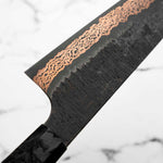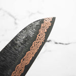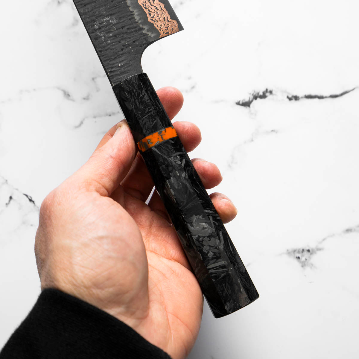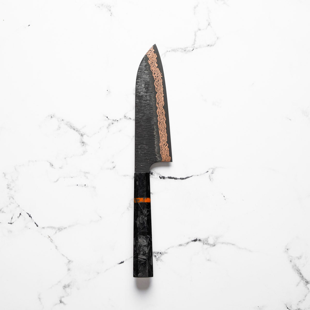 Hatsukokoro Yorokobi Kurouchi SLD Damascus Tsuchime Santoku 180mm - Carbon Fibre