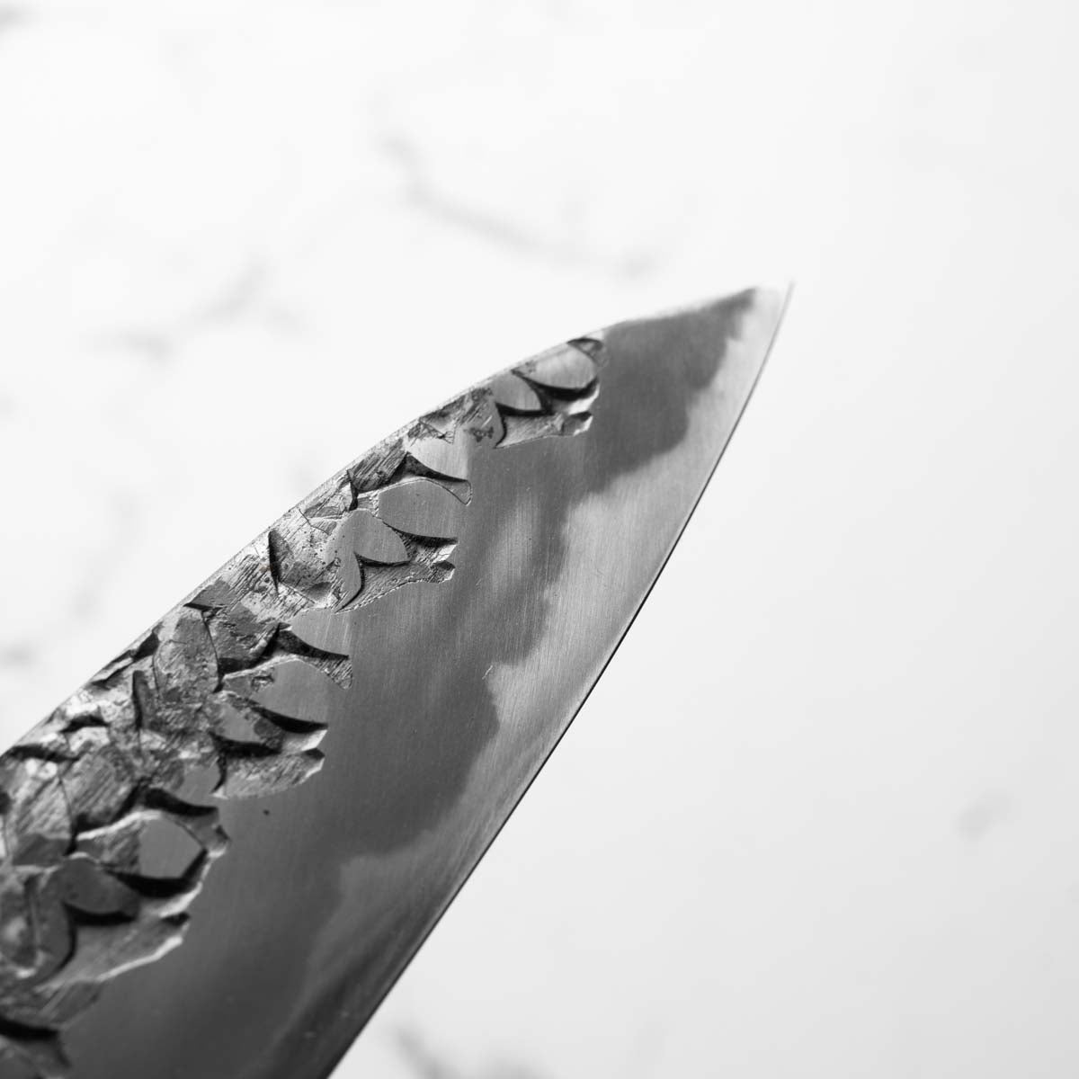 Embracing a rapid rise in popularity for his unique designs and committment to striving for perfection, Shunsuke Manaka is the man behind Kisuke knives. From the sketchbook to the kitchen, he is the sole craftsman behind the entire knifemaking process. Shunsuke engineers these knives using a process known as Warikomi, whereby a glowing hot piece of steel is split, and the core steel is wedged in and forged together. The split steel becomes the outer layers, and the core steel is exposed at the edge. This process produces a stronger, tougher more durable blade.