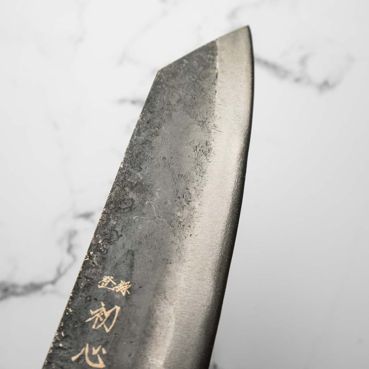 This knife is made from a high-carbon steel and as such, will require a little more care than a regular off-the-shelf knife. It must be dried shortly after use, as prolonged exposure to moisture can cause rust spots to appear. A very light coat of oil during storage also helps to prevent rust spots. A patina (colouration and seasoning of the steel) will occur with use.