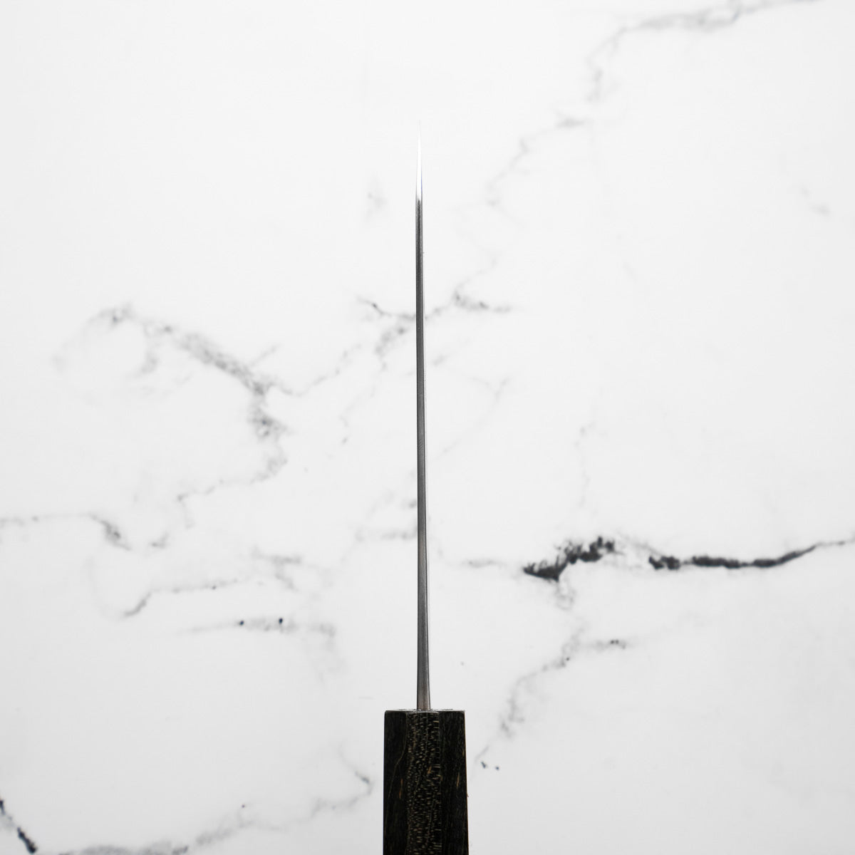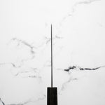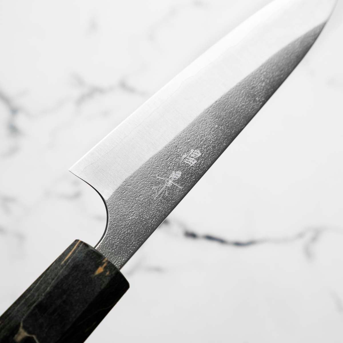 Japanese White Steel #2, a traditional high-carbon steel, is cherished for its purity and fine grain structure, enabling razor-sharp edges, at the cost of being reactive. It is one of the easiest steels to sharpen, but cannot be left wet for even short periods otherwise rust spots can occur. If you’re fastidious in your knife maintenance, this knife steel can be extremely rewarding to use.