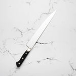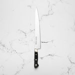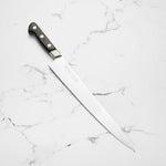 The Sujihiki knife, a traditional Japanese slicer, is designed for carving and fileting. With its long, narrow blade, typically ranging from 240mm to 330mm, it excels in creating clean, smooth cuts through meat and fish. Its length ensures long, uninterrupted strokes, making it perfect for precise slicing tasks.