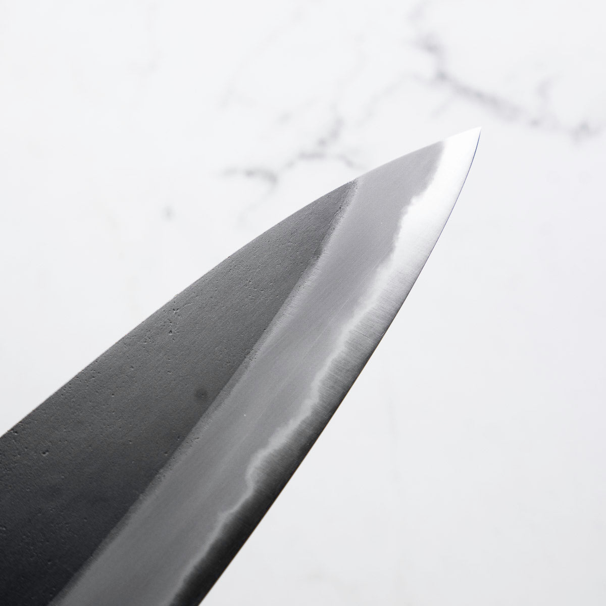 Japanese White Steel #2, a traditional high-carbon steel, is cherished for its purity and fine grain structure, enabling razor-sharp edges, at the cost of being reactive. It is one of the easiest steels to sharpen, but cannot be left wet for even short periods otherwise rust spots can occur. If you’re fastidious in your knife maintenance, this knife steel can be extremely rewarding to use.