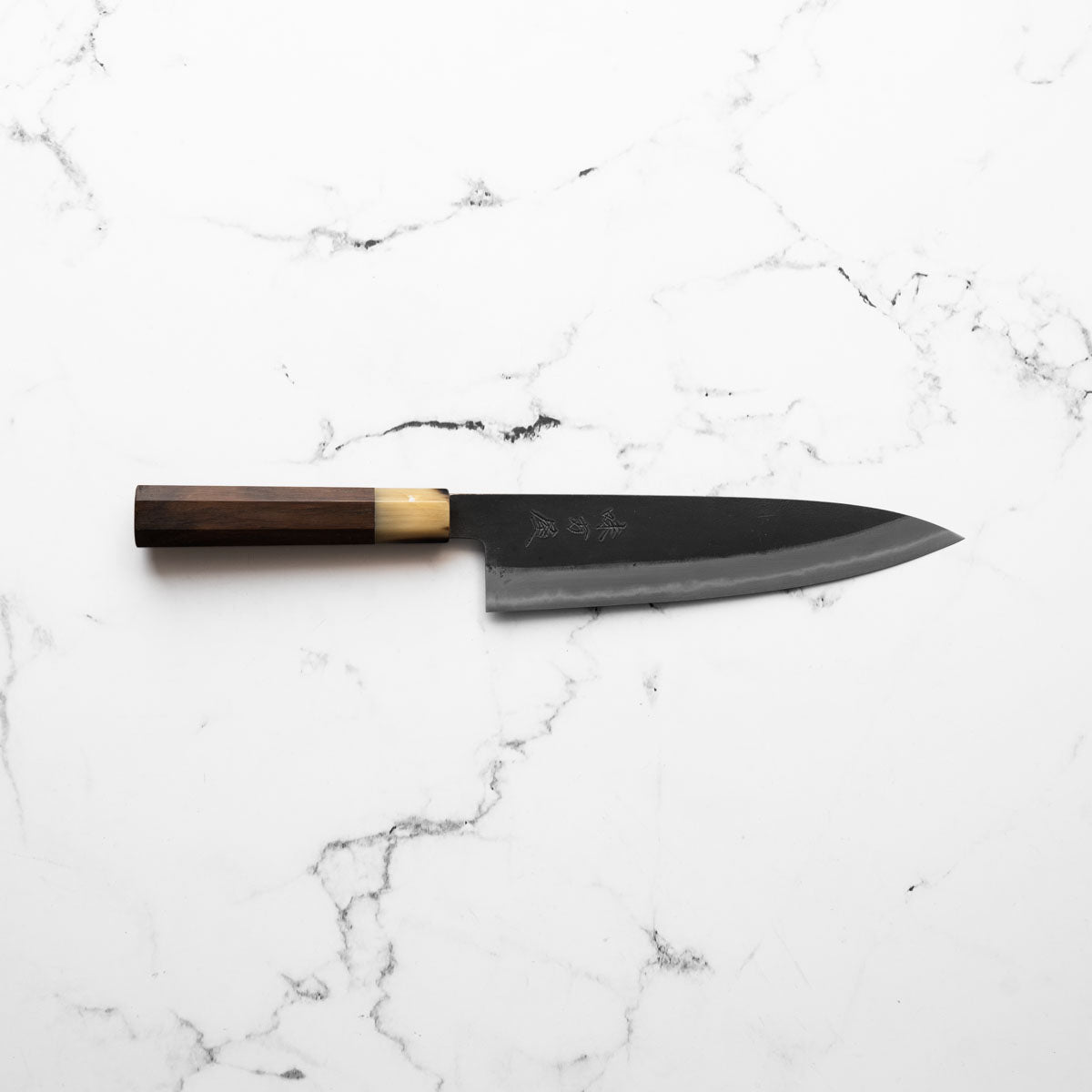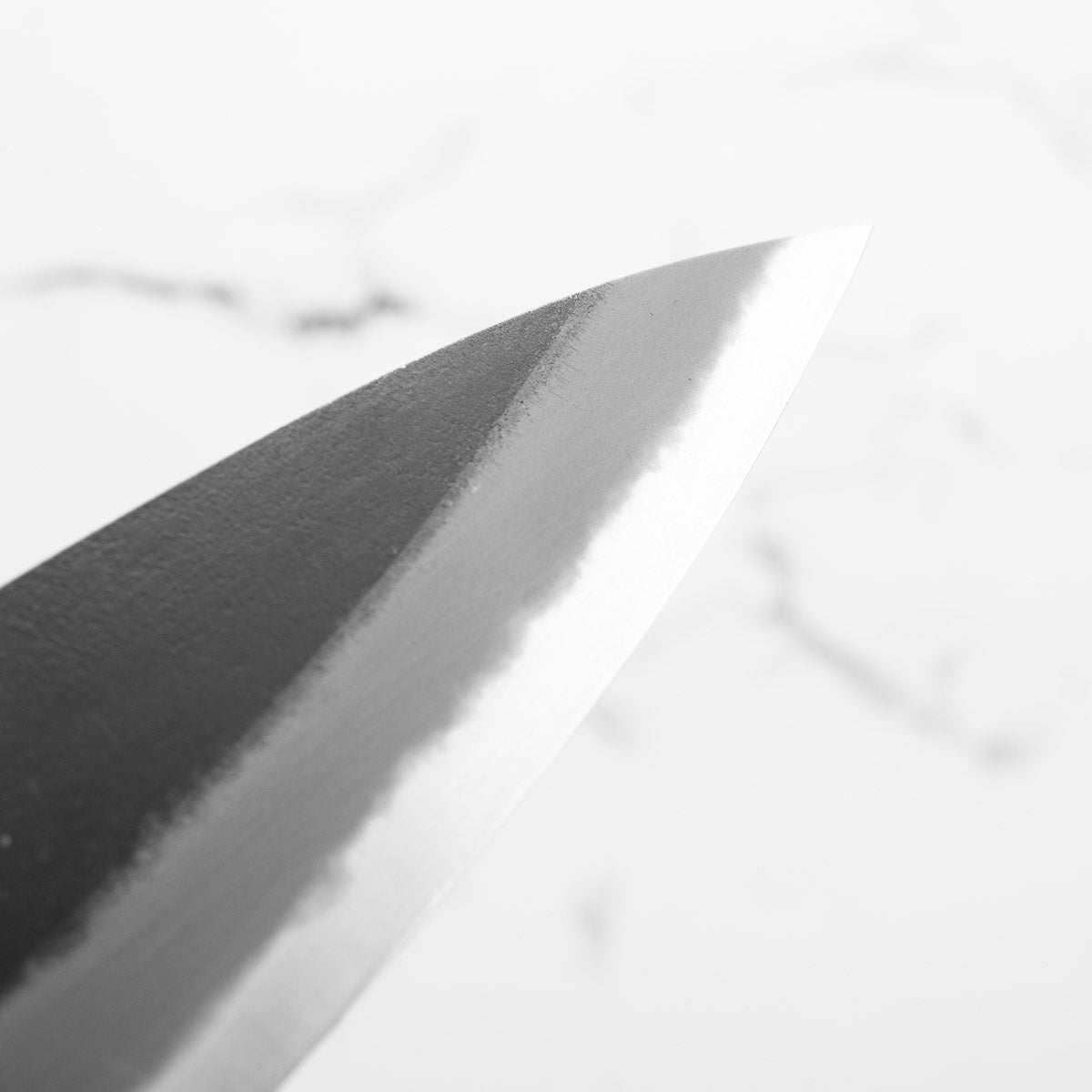 Japanese White Steel #2, a traditional high-carbon steel, is cherished for its purity and fine grain structure, enabling razor-sharp edges, at the cost of being reactive. It is one of the easiest steels to sharpen, but cannot be left wet for even short periods otherwise rust spots can occur. If you’re fastidious in your knife maintenance, this knife steel can be extremely rewarding to use.