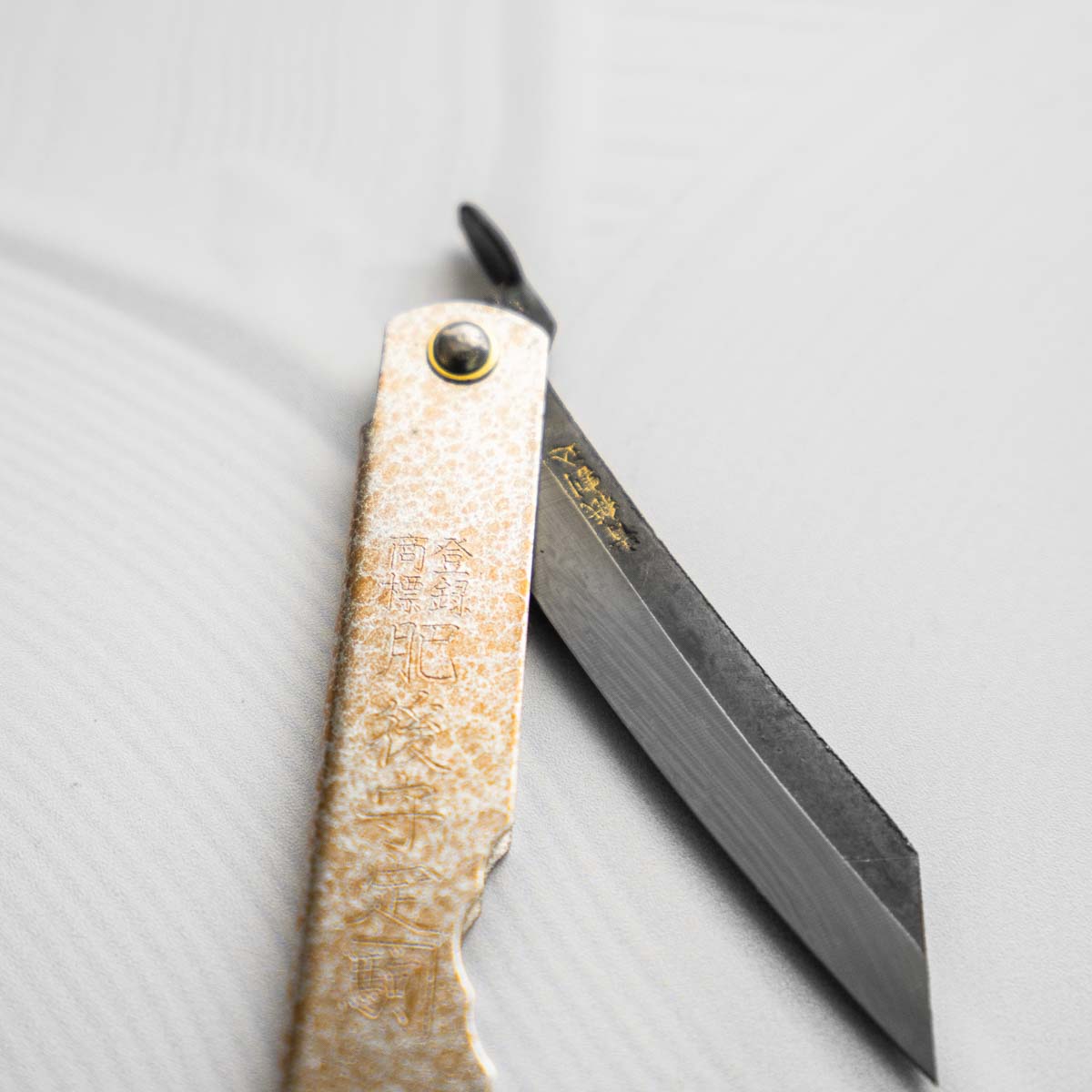 He named it “Higonokami Knife” because many of his customers were in Kumamoto area (formally Higo country), which turned out to dramatically increase his sales. The blades have gradually changed their shapes. Unlike single-edged knives, the double-edged blades (V-shaped cross section) were in those days considered common. The earlier blades had a sharper tip (shape of a bamboo leaf), but now they have square shapes. The sheaths had a vertically folding style and a cross folding style, now the vertical one has to be custom made.