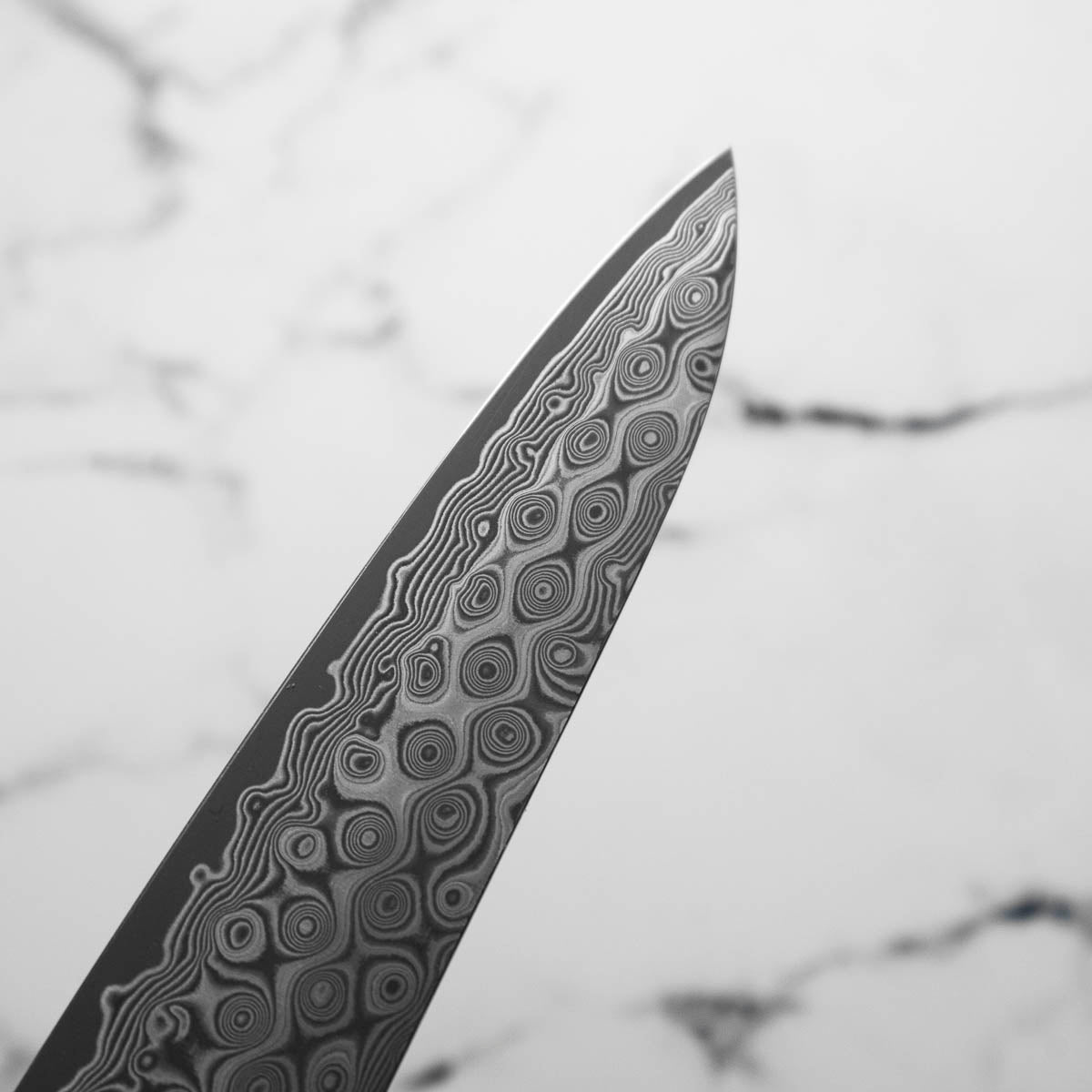 Nigara Hamono are truly some of the most experienced knifemakers in Japan. Now on their 8th generation of blacksmiths, they are masters at stainless damascus forging and heat treatment. The Anmon Damascus we have available have a matte finish and are polished underneath, resulting in a brilliant visual contrast.
