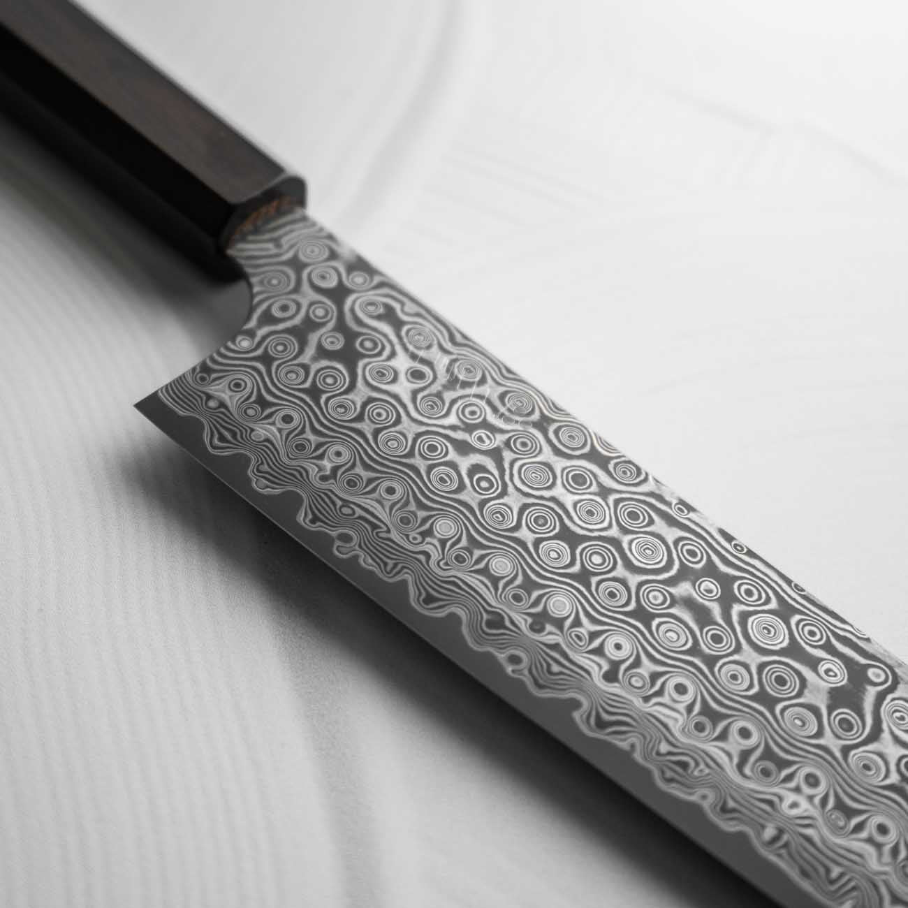 Nigara Hamono are truly some of the most experienced knifemakers in Japan. Now on their 8th generation of blacksmiths, they are masters at stainless damascus forging and heat treatment. The Anmon Damascus we have available have a matte finish and are polished underneath, resulting in a brilliant visual contrast.