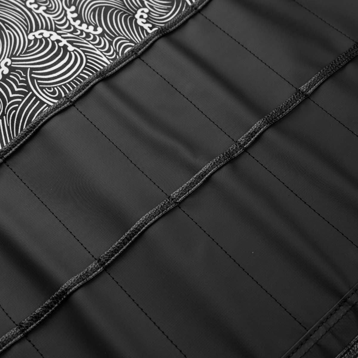 Elevate your culinary travels with the assured protection of the 7 Pocket 1000D PVC Knife Roll. This fundamental knife roll is meticulously crafted for both accomplished chefs and emerging culinary talents, showcasing a streamlined roll-up design paired with five dedicated knife pockets. This version is lined with a beautiful mono-tone Hokusai inspired wave pattern.