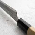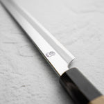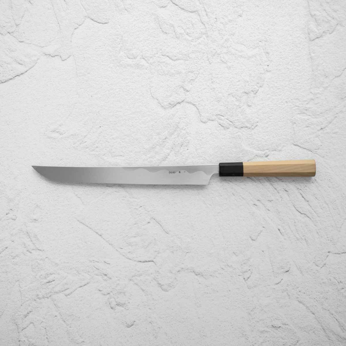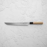 The Sakimaru knife is a specialized Japanese knife, often regarded as a variation of the traditional sashimi knife. It features a long, slender, and gracefully curved blade, designed for making precise, thin cuts of fish, particularly for sashimi. The Sakimaru's elongated shape allows for drawing long, uninterrupted slices, embodying the art of Japanese culinary techniques.