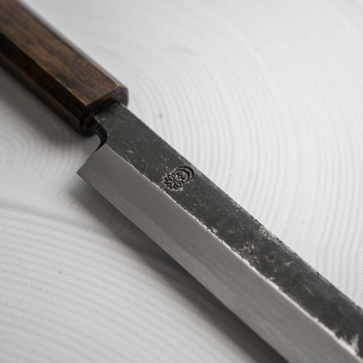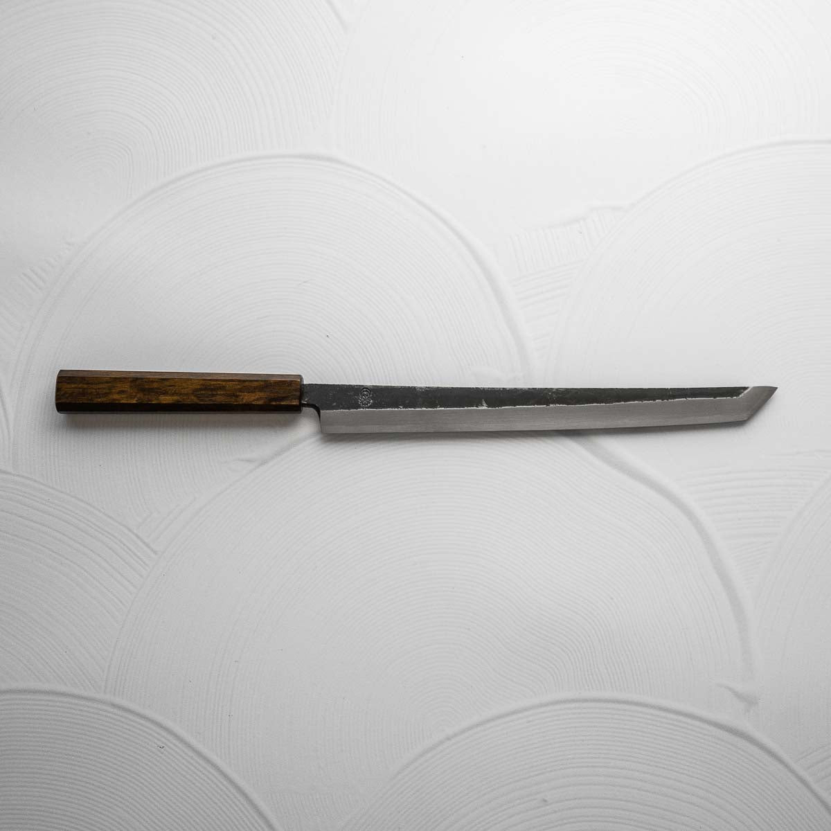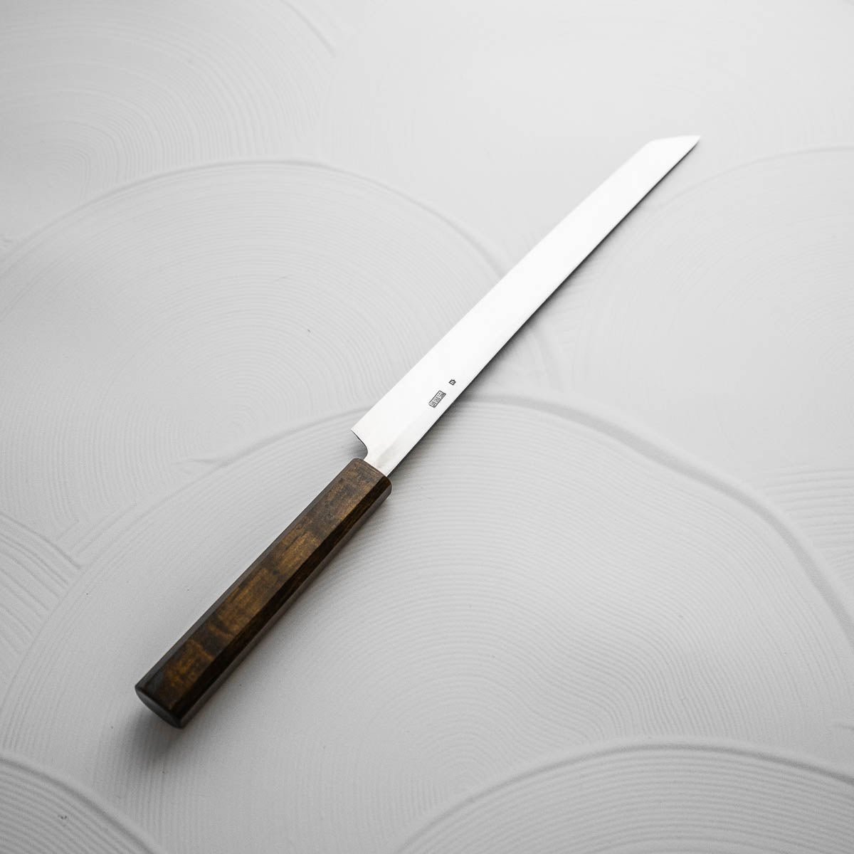 The Sakimaru knife is a specialized Japanese knife, often regarded as a variation of the traditional sashimi knife. It features a long, slender, and gracefully curved blade, designed for making precise, thin cuts of fish, particularly for sashimi. The Sakimaru's elongated shape allows for drawing long, uninterrupted slices, embodying the art of Japanese culinary techniques.