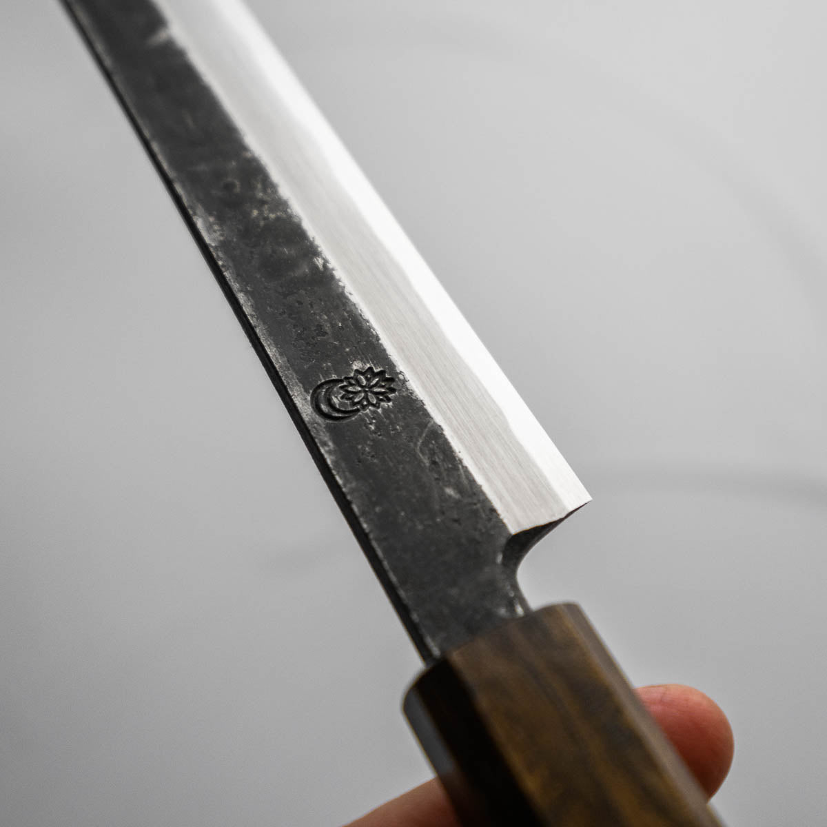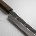 Japanese White Steel #2, a traditional high-carbon steel, is cherished for its purity and fine grain structure, enabling razor-sharp edges, at the cost of being reactive. It is one of the easiest steels to sharpen, but cannot be left wet for even short periods otherwise rust spots can occur. If you’re fastidious in your knife maintenance, this knife can steel can be extremely rewarding to use.