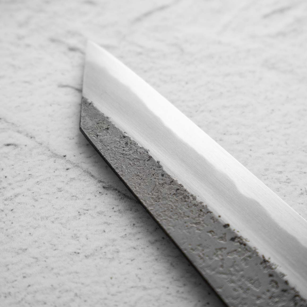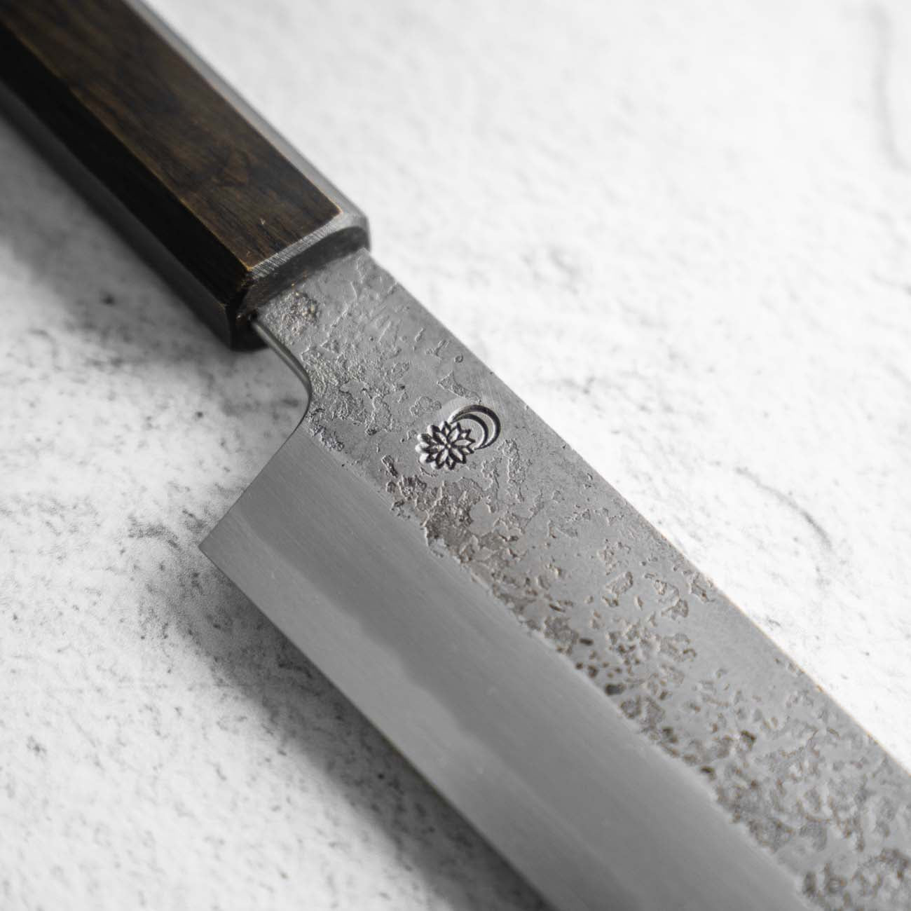 Japanese White Steel #2, a traditional high-carbon steel, is cherished for its purity and fine grain structure, enabling razor-sharp edges, at the cost of being reactive. It is one of the easiest steels to sharpen, but cannot be left wet for even short periods otherwise rust spots can occur. If you’re fastidious in your knife maintenance, this knife can steel can be extremely rewarding to use.