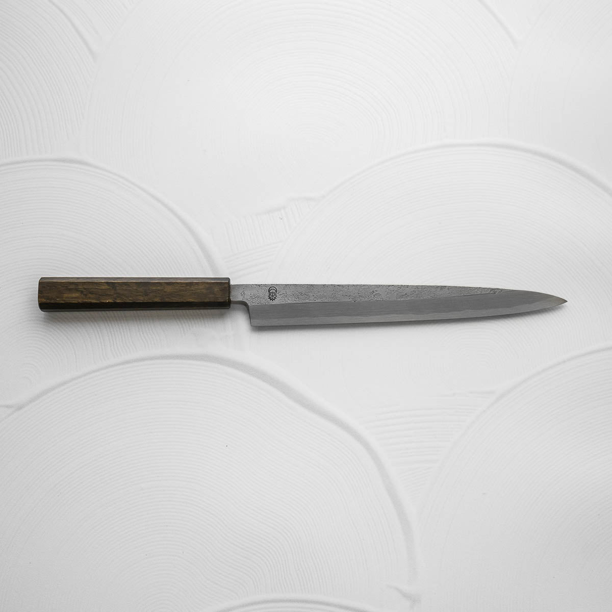 The Yanagiba knife, a staple in traditional Japanese cuisine, is a slender, long-bladed knife primarily used for slicing sashimi and sushi. Its graceful, single-beveled edge guarantees precise, thin cuts, preserving the texture and integrity of the fish. Revered for its sharpness and balance, the Yanagiba is essential for authentic Japanese food preparation.