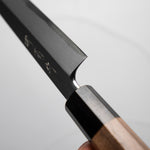 Japanese White Steel #2, a traditional high-carbon steel, is cherished for its purity and fine grain structure, enabling razor-sharp edges, at the cost of being reactive. It is one of the easiest steels to sharpen, but cannot be left wet for even short periods otherwise rust spots can occur. If you’re fastidious in your knife maintenance, this knife can steel can be extremely rewarding to use.