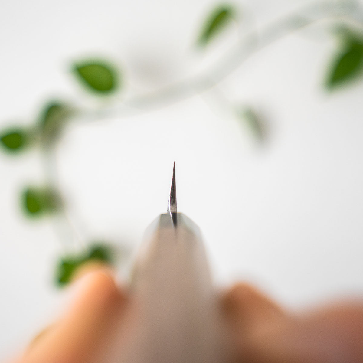 Japanese White Steel #2, a traditional high-carbon steel, is cherished for its purity and fine grain structure, enabling razor-sharp edges, at the cost of being reactive. It is one of the easiest steels to sharpen, but cannot be left wet for even short periods otherwise rust spots can occur. If you’re fastidious in your knife maintenance, this knife can steel can be extremely rewarding to use.