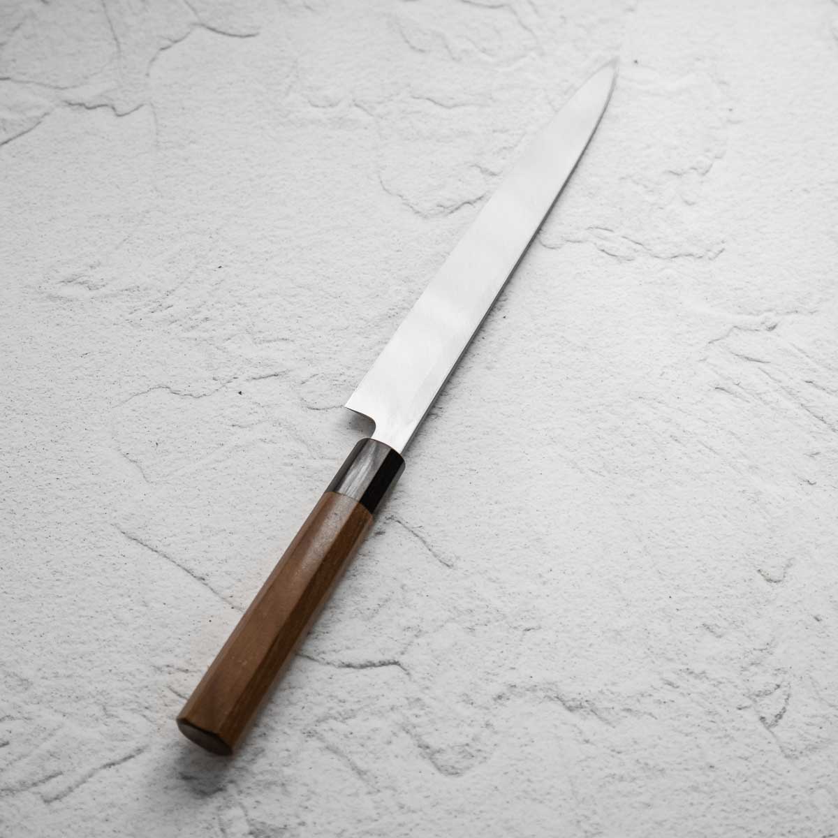 The Yanagiba knife, a staple in traditional Japanese cuisine, is a slender, long-bladed knife primarily used for slicing sashimi and sushi. Its graceful, single-beveled edge guarantees precise, thin cuts, preserving the texture and integrity of the fish. Revered for its sharpness and balance, the Yanagiba is essential for authentic Japanese food preparation.