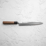 Japanese White Steel #2, a traditional high-carbon steel, is cherished for its purity and fine grain structure, enabling razor-sharp edges, at the cost of being reactive. It is one of the easiest steels to sharpen, but cannot be left wet for even short periods otherwise rust spots can occur. If you’re fastidious in your knife maintenance, this knife can steel can be extremely rewarding to use.