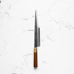 The Sujihiki knife, a traditional Japanese slicer, is designed for carving and fileting. With its long, narrow blade, typically ranging from 240mm to 330mm, it excels in creating clean, smooth cuts through meat and fish. Its length ensures long, uninterrupted strokes, making it perfect for precise slicing tasks.