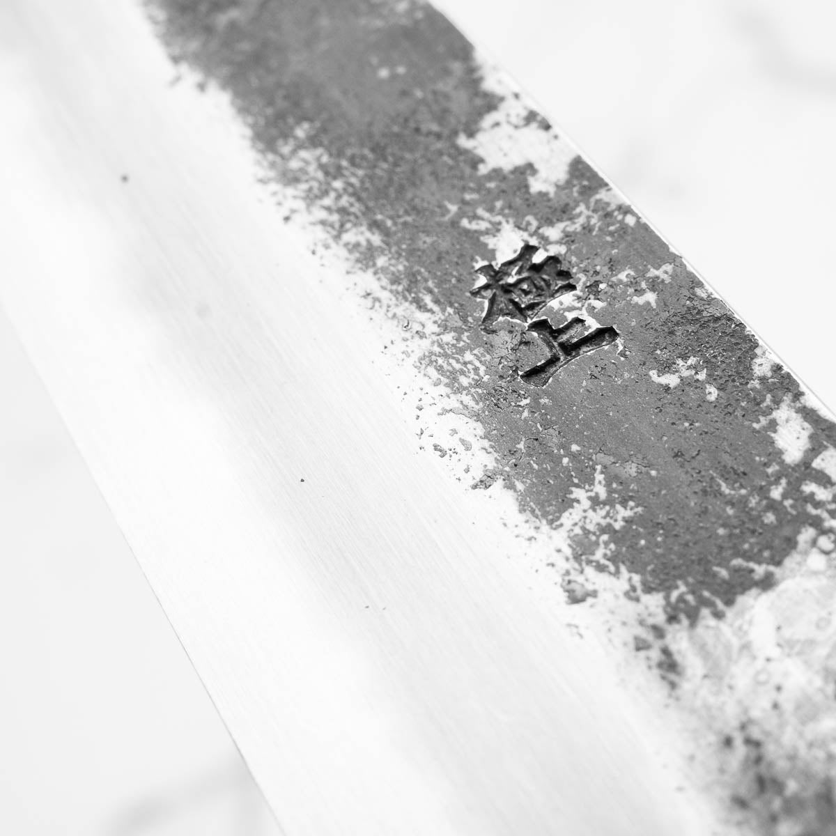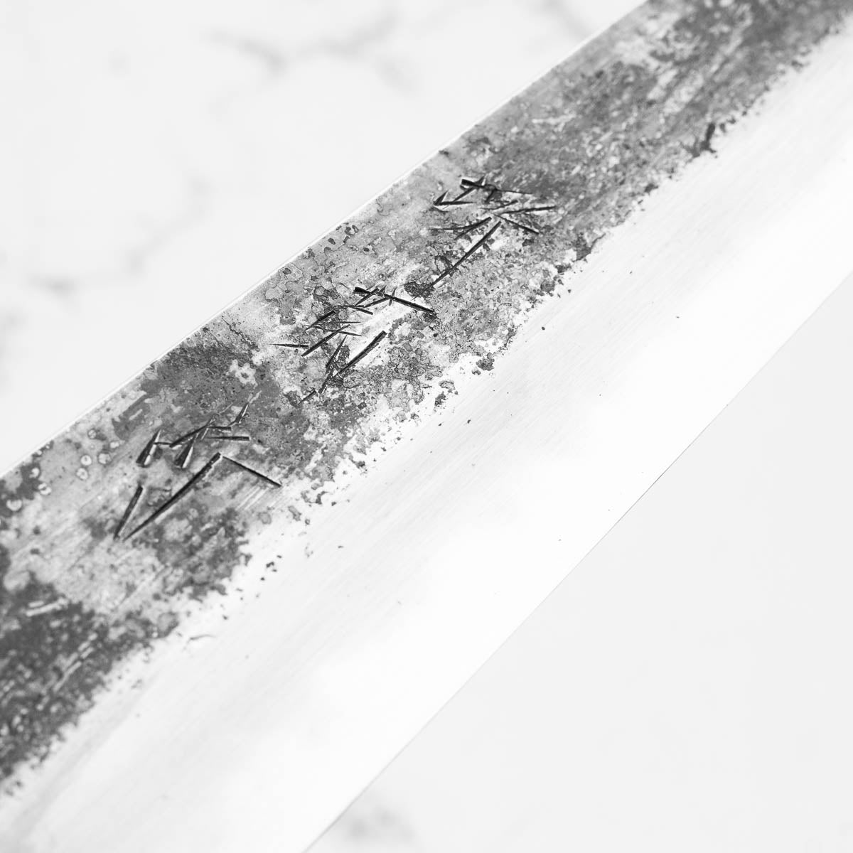 Japanese White Steel #2, a traditional high-carbon steel, is cherished for its purity and fine grain structure, enabling razor-sharp edges, at the cost of being reactive. It is one of the easiest steels to sharpen, but cannot be left wet for even short periods otherwise rust spots can occur. If you’re fastidious in your knife maintenance, this knife can steel can be extremely rewarding to use.