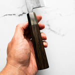 Japanese White Steel #2, a traditional high-carbon steel, is cherished for its purity and fine grain structure, enabling razor-sharp edges, at the cost of being reactive. It is one of the easiest steels to sharpen, but cannot be left wet for even short periods otherwise rust spots can occur. If you’re fastidious in your knife maintenance, this knife steel can be extremely rewarding to use.