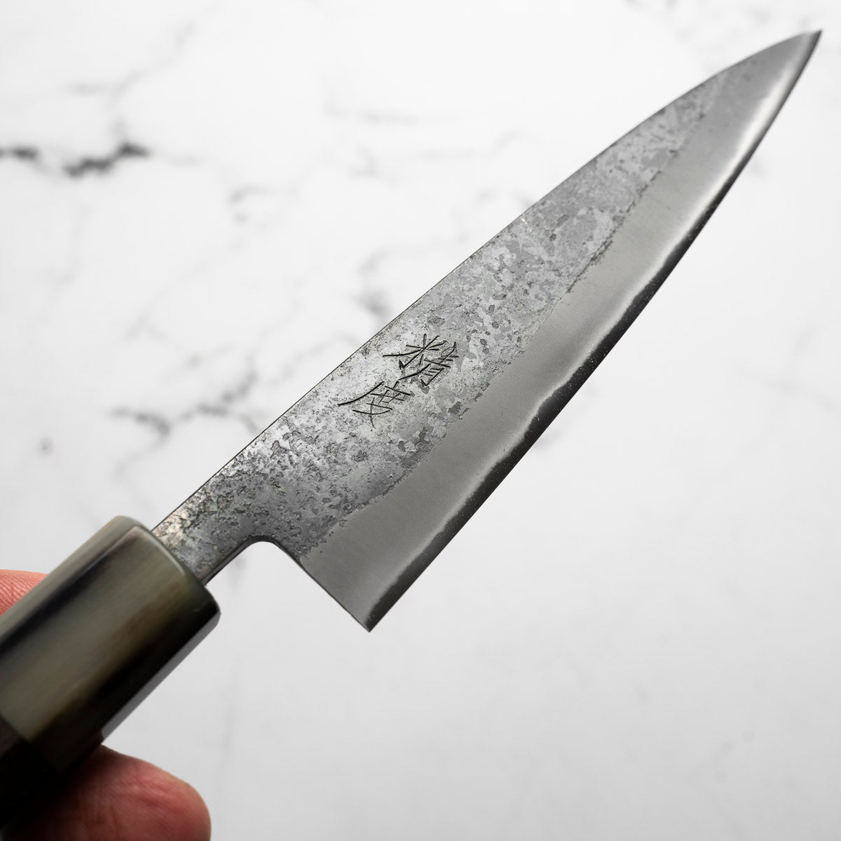 Japanese White Steel #2, a traditional high-carbon steel, is cherished for its purity and fine grain structure, enabling razor-sharp edges, at the cost of being reactive. It is one of the easiest steels to sharpen, but cannot be left wet for even short periods otherwise rust spots can occur. If you’re fastidious in your knife maintenance, this knife steel can be extremely rewarding to use.