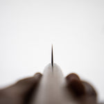 Japanese White Steel #2, a traditional high-carbon steel, is cherished for its purity and fine grain structure, enabling razor-sharp edges, at the cost of being reactive. It is one of the easiest steels to sharpen, but cannot be left wet for even short periods otherwise rust spots can occur. If you’re fastidious in your knife maintenance, this knife steel can be extremely rewarding to use.