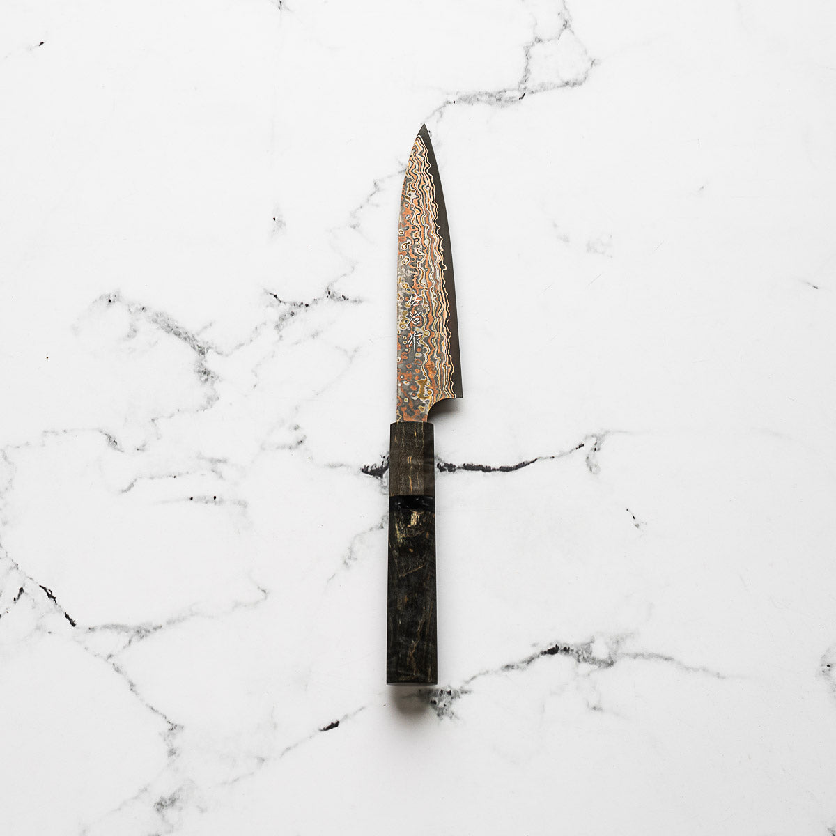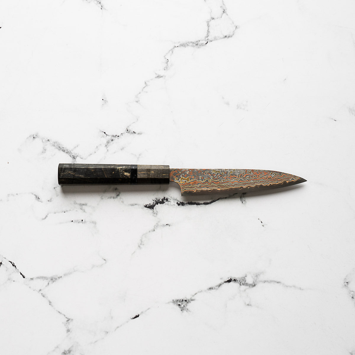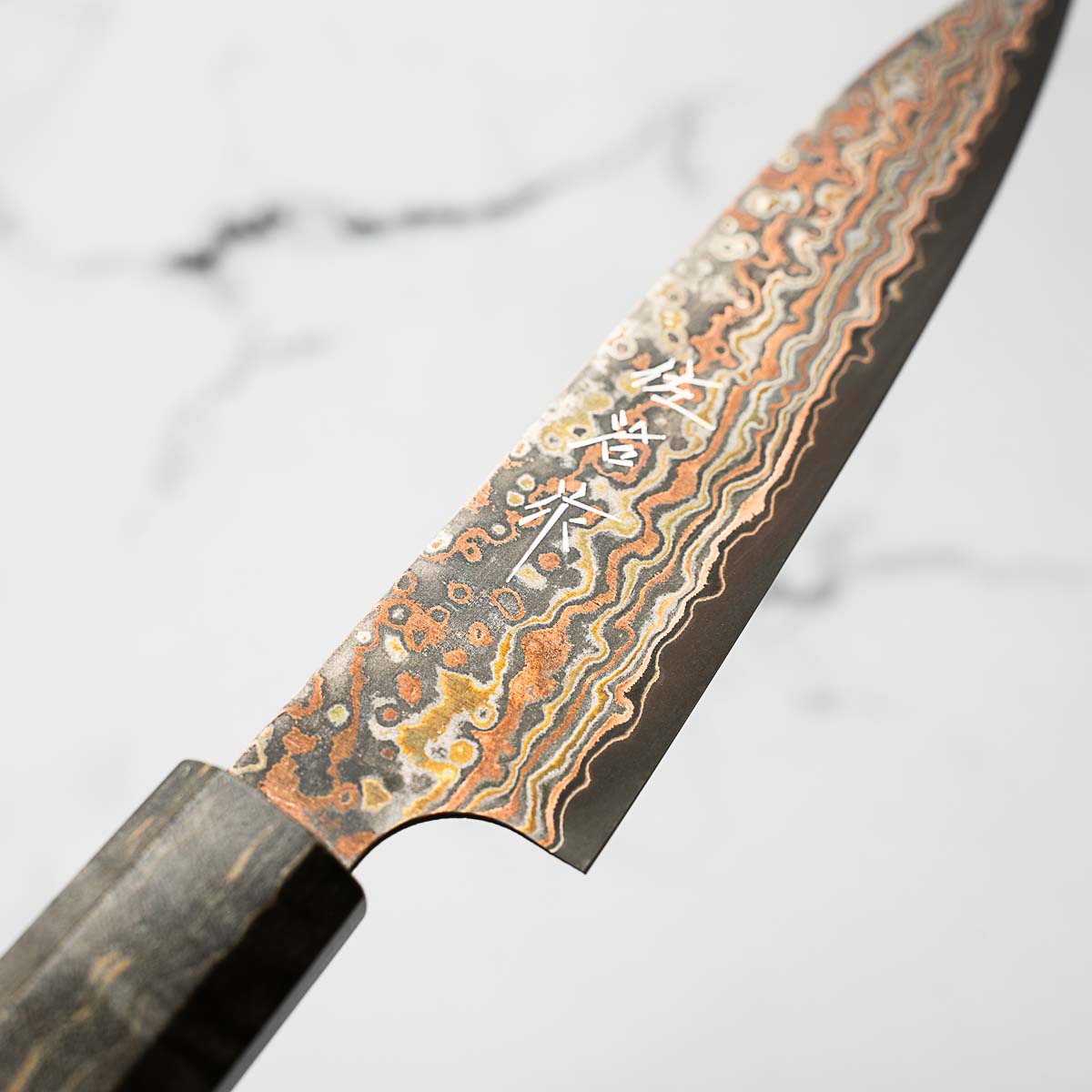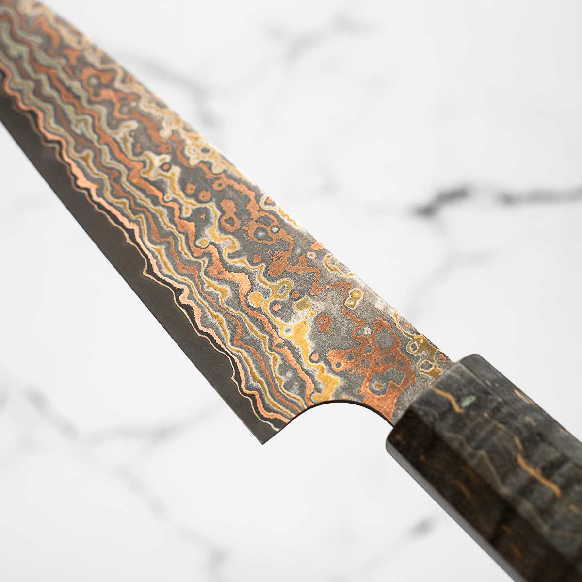 He works across a wide spectrum of steels, from classic Japanese carbon steels to advanced stainless alloys like R2 and VG10. His signature Damascus finishes — including Rainbow, Diamond, and Black Nickel — are unmistakable, and are often paired with an eclectic range of handle styles that reflect both innovation and deep respect for materials.