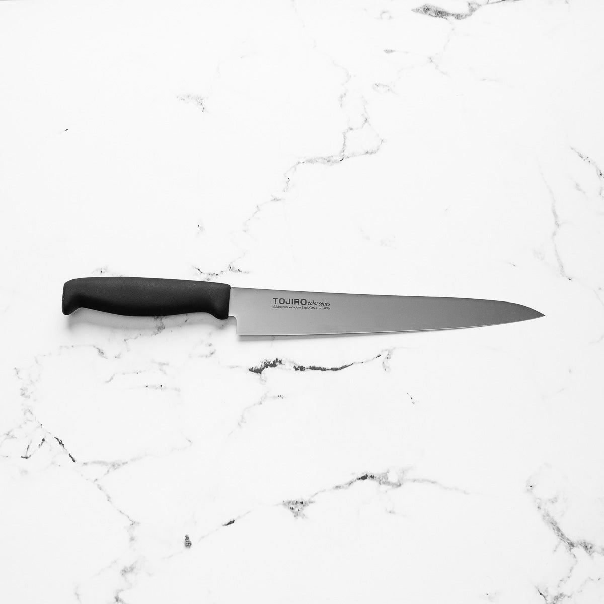 The Sujihiki knife, a traditional Japanese slicer, is designed for carving and fileting. With its long, narrow blade, typically ranging from 240mm to 330mm, it excels in creating clean, smooth cuts through meat and fish. Its length ensures long, uninterrupted strokes, making it perfect for precise slicing tasks.
